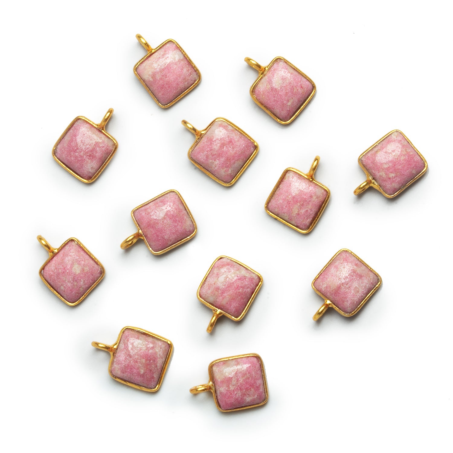 These 8mm Vermeil Bezeled Thulite Square Pendants feature soft, rosy pink hues framed in warm vermeil, creating a charming balance of color and shine. Each cabochon shows Thulite’s naturally varied tones—from milky blush to deeper petal-pink—giving every pendant a gentle, organic character. The polished surface highlights the stone’s subtle marbling while the gold-finished bezel adds a refined, elegant touch.