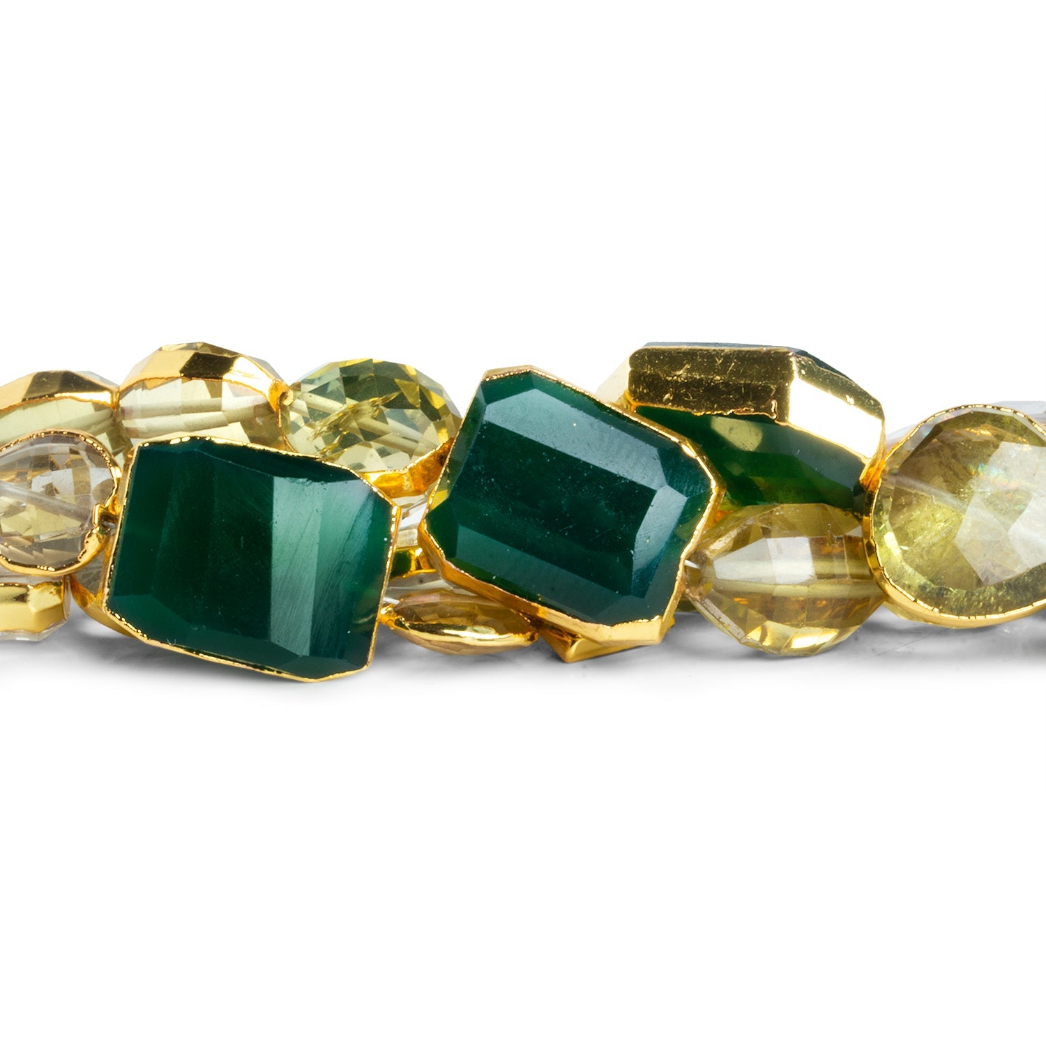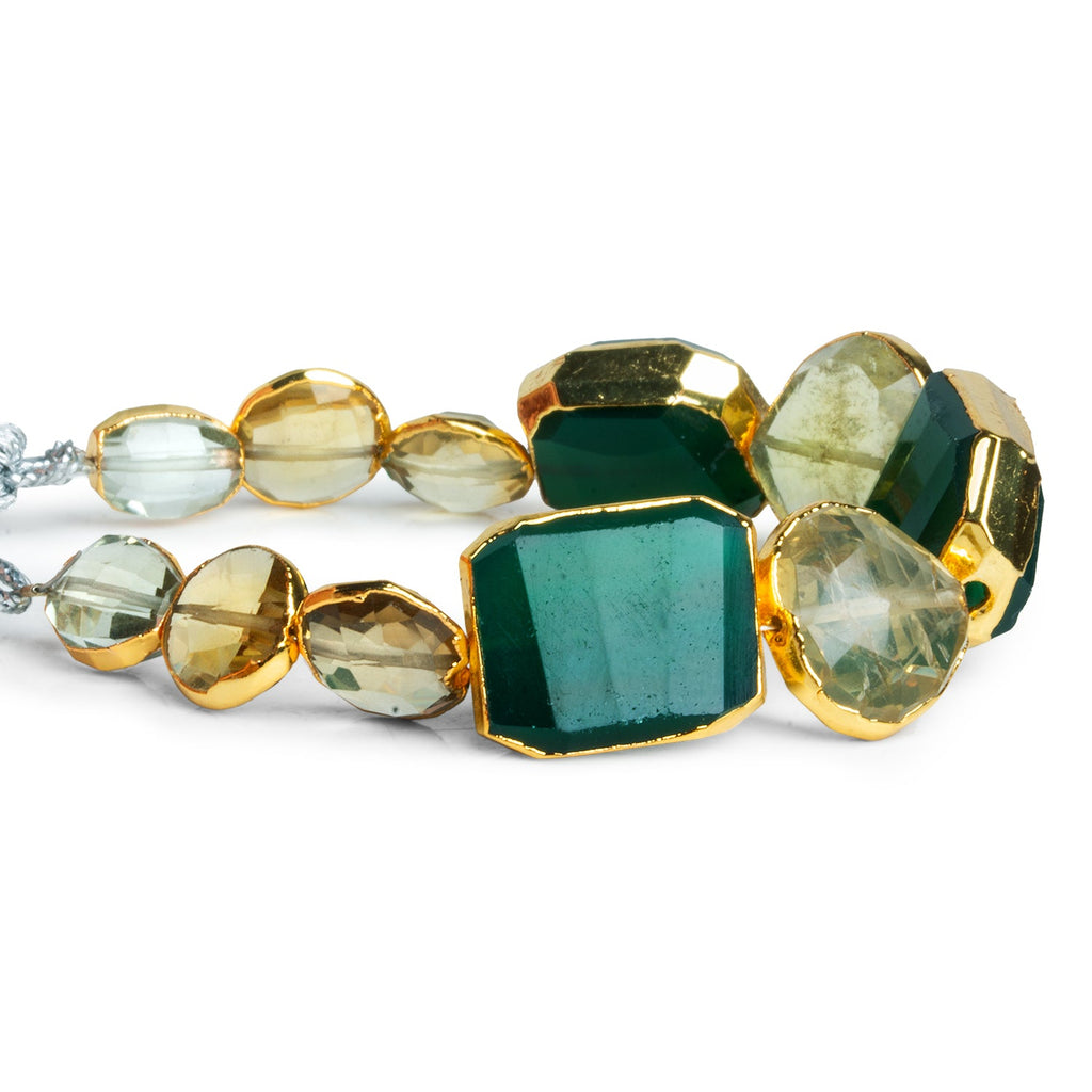 Elevate your designs with these stunning Gold Leafed Multi Gemstone Faceted Beads, expertly crafted for high-end jewelry making. This luxurious strand showcases a captivating mix of natural gemstones—ranging from deep forest green to soft lemon-yellow—each meticulously faceted to catch the light from every angle. Framed in radiant gold leaf, the dynamic color palette and striking shapes make these beads perfect for statement pieces, whether strung alone or combined with complementary elements.