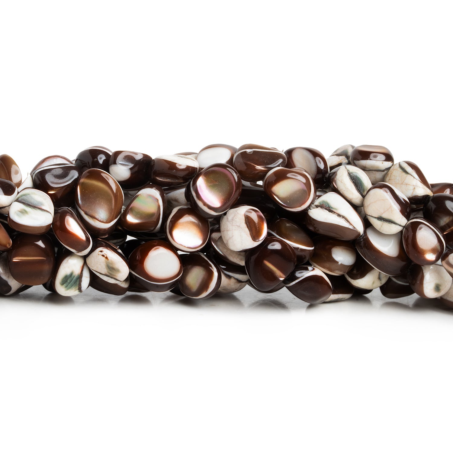 Beads range from about 7x6mm to 11x10mm with a 1mm Large Hole. These beautiful nuggets offer a unique display of iridescent mother of pearl flashing forth from brown and white shell bodies. Our smooth polished, organically shaped pieces are destined to dazzle in nearly any jewelry design, and will complement the widest variety of metals, gemstones and pearl pieces. Imbue your next projects in necklaces, earrings and bracelets with these earthy toned treasures with a remarkable nacre.