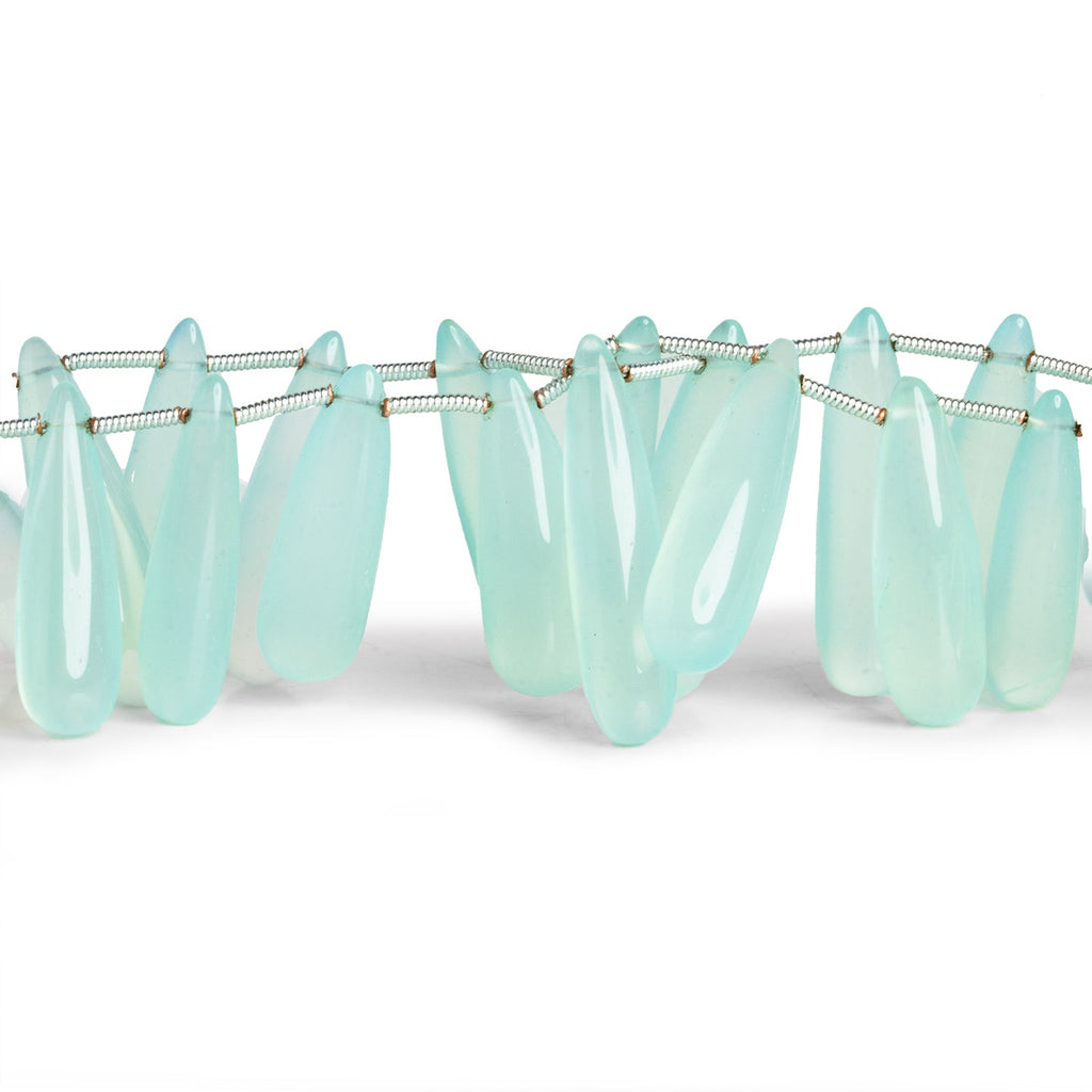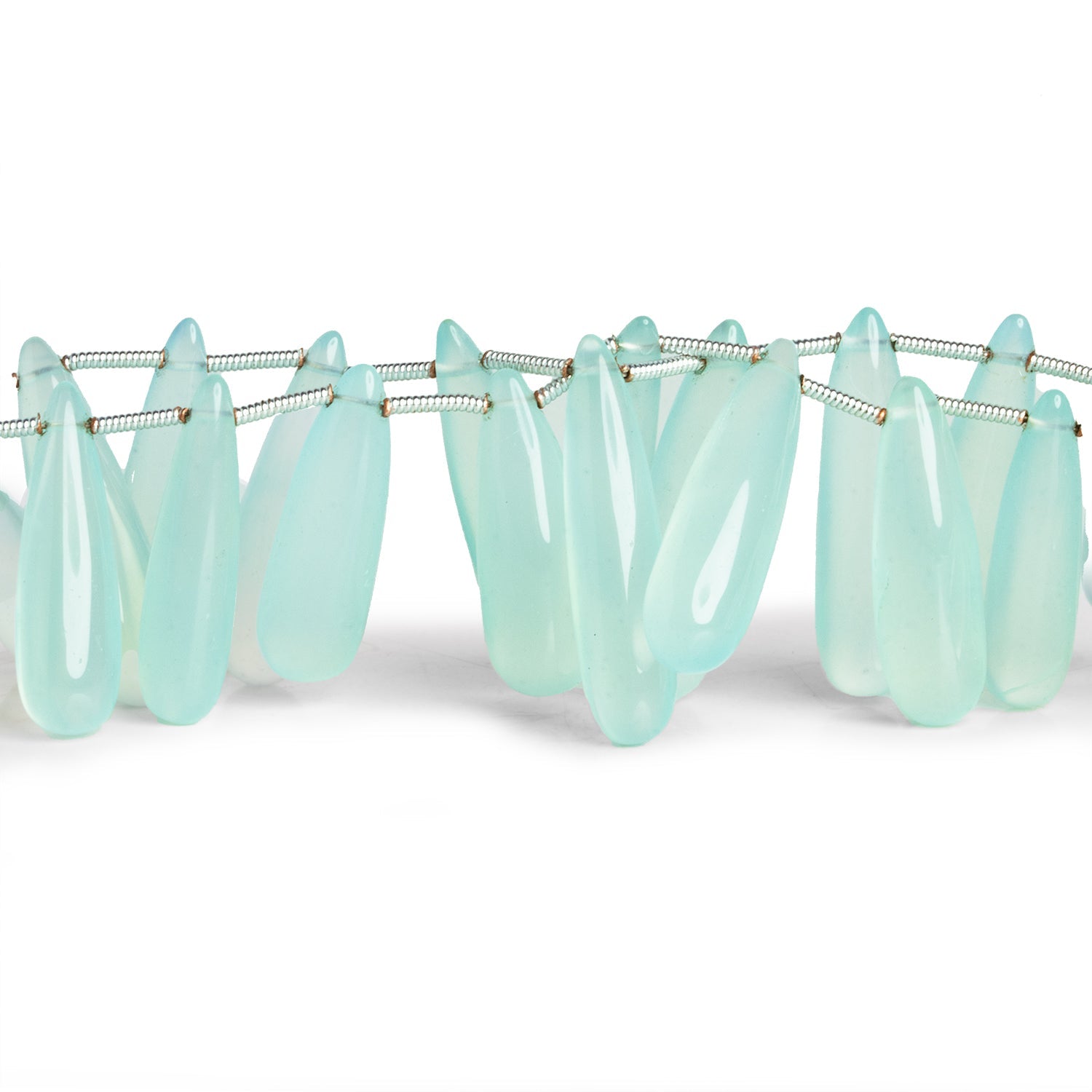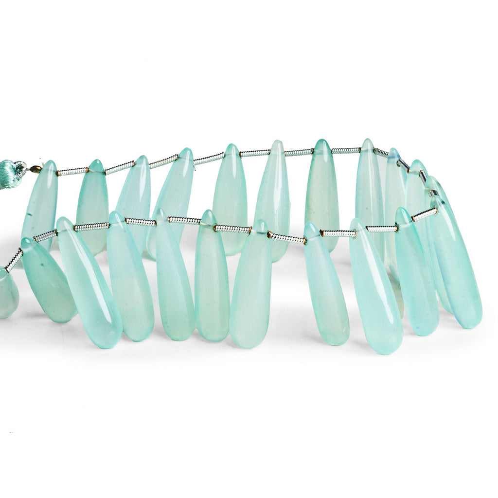 Beads measure about 20x7mm to 25x8mm. These beads show off a light blue color on alluring, long plain teardrop bodies. This curated strand is perfect for fans of colorful drops and blue chalcedony alike!