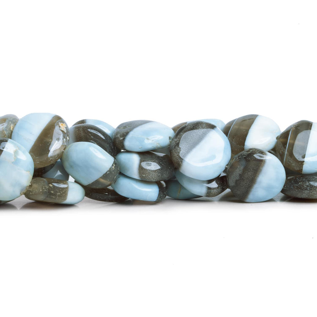 Beads range from about 10mm to 17mm with little further variation. These curated strands feature the iconic banded textures and soft blue hues of Denim a.k.a Owyhee Opal. Expect a striking coin shape that highlights the beads' striped patterns. Fans of this gemstone will love these pieces for their beautiful, natural mingling of opaque blue sections with dark translucent striations