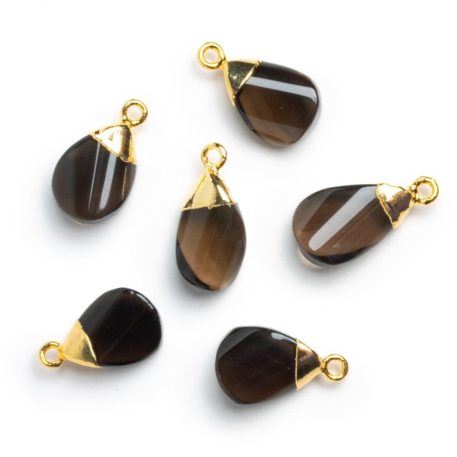 Beads average about 18x11mm. These elegant pendants feature a sleek twisted pear shape with a relatively dark, smoky coloration. These clear-bodied beauties make a great impression paired with our signature gold leaf.