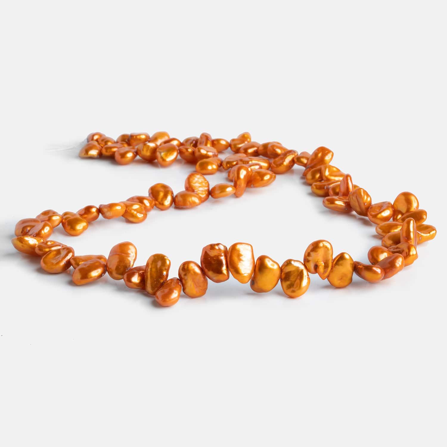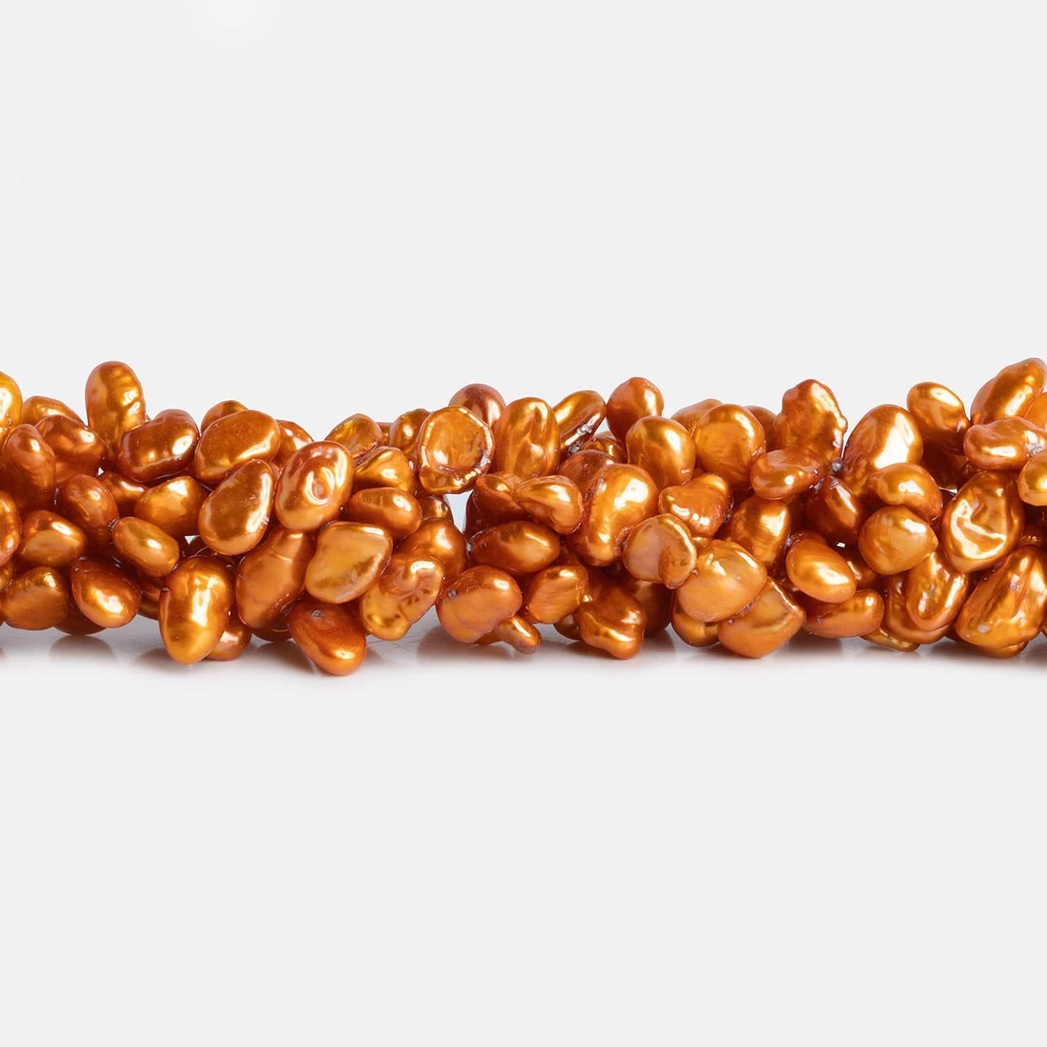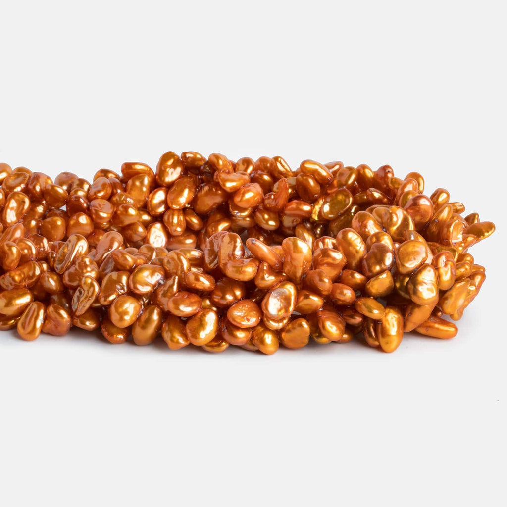Pearls measure about 7x5mm to 9x7mm. These exquisite pearls have a lovely charm showing off a rich golden orange color palette that is highly consistent.
