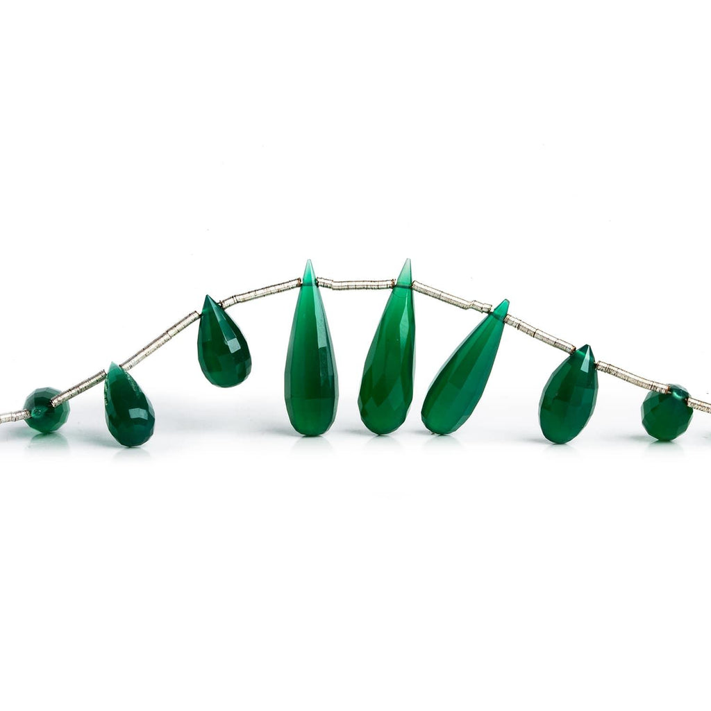 Beads measure 9x5mm to 22x6.5mm. This curated strand features masterfully faceted teardrop bodies with sleek and thin shapes. Expect the the rich green color associated with Green Onyx to be perfectly consistent across the strand.