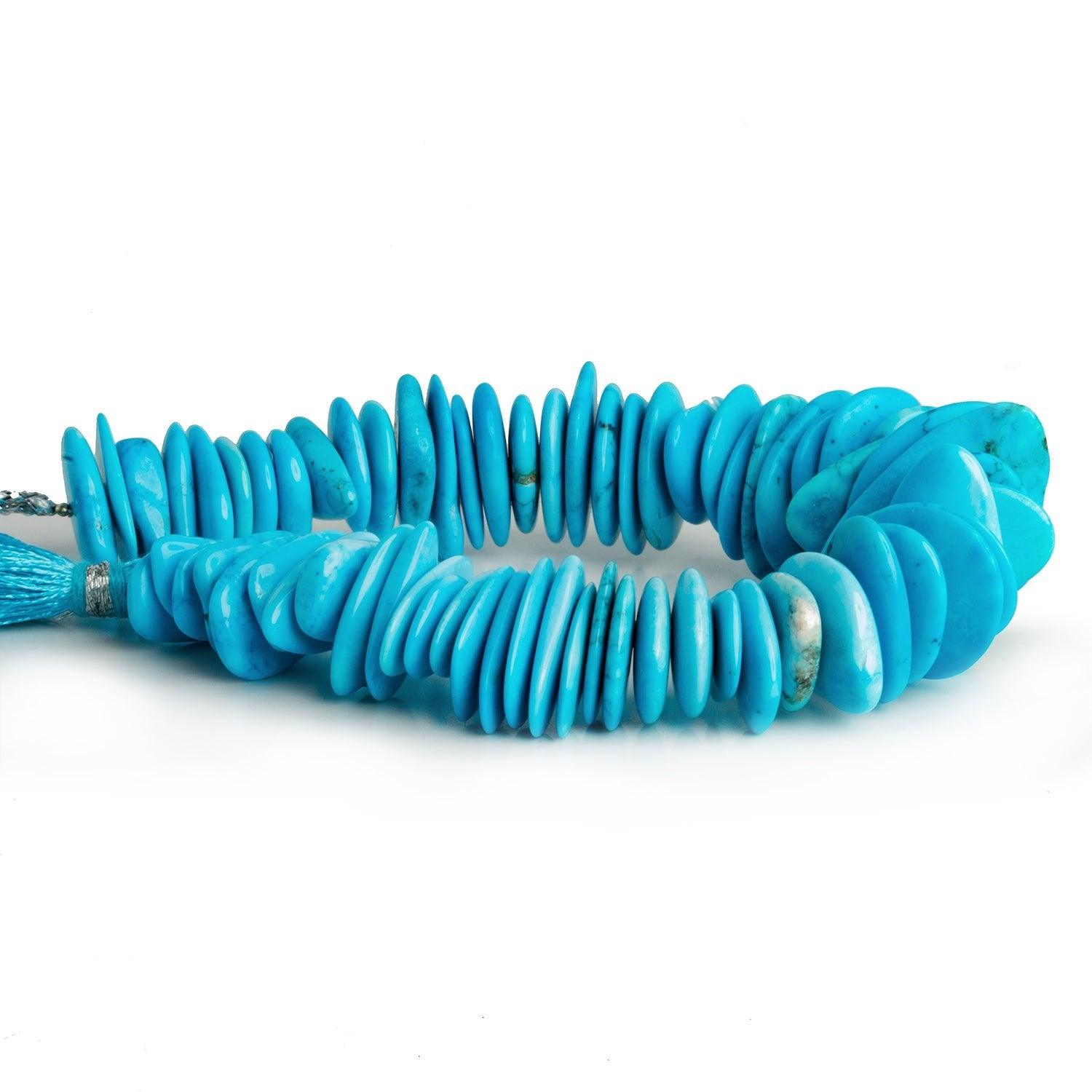 Beads range from about 16x10mm to 30x15mm. These sleek, smooth polished chip beads are graduated in size and showcase a moderately light turquoise blue color palette on opaque bodies. This strand includes particularly large & eye-catching chips with a thin shape!
