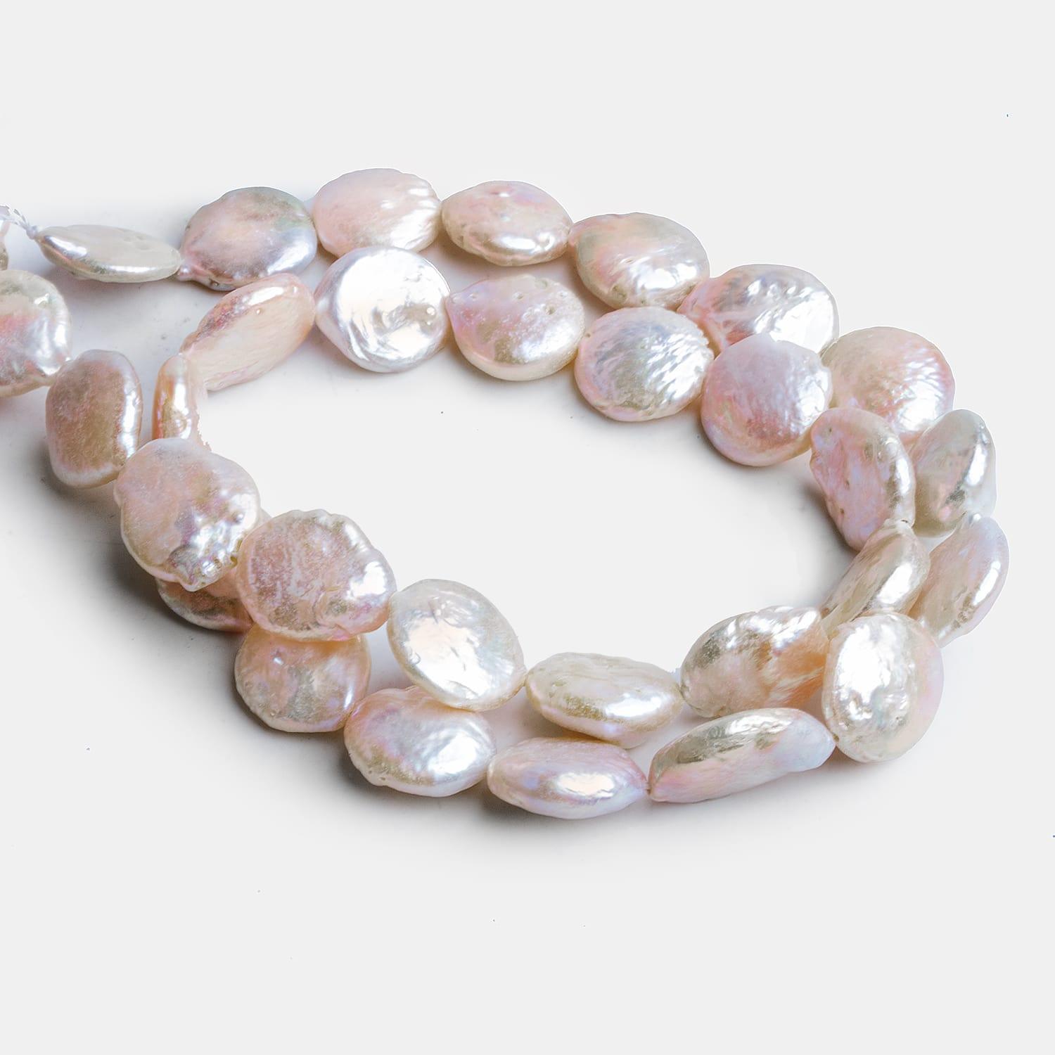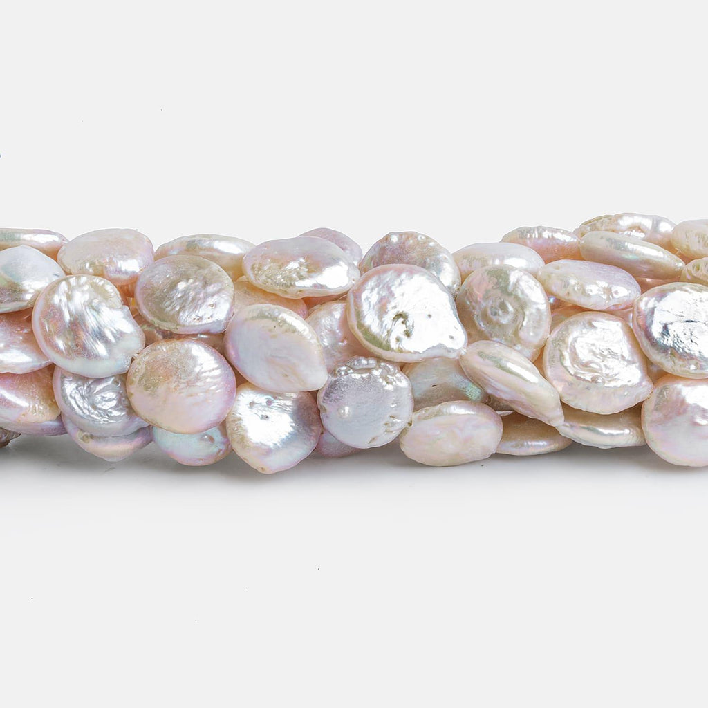 Pearls measure about 10x9mm to 15x13mm with little further variation. These pearls show off a gorgeous color palette the brings together a mélange of pleasing pink, peach & cream tones. Expect lustrous, light bodies with a slightly irregular coin shape. A range of subtle and beautiful accent colors grace the pearls of these curated strands.
