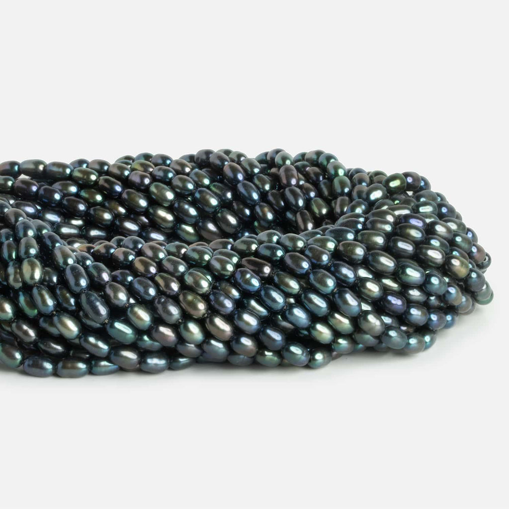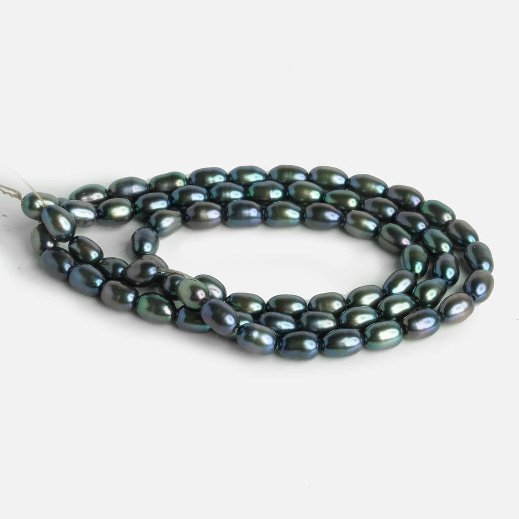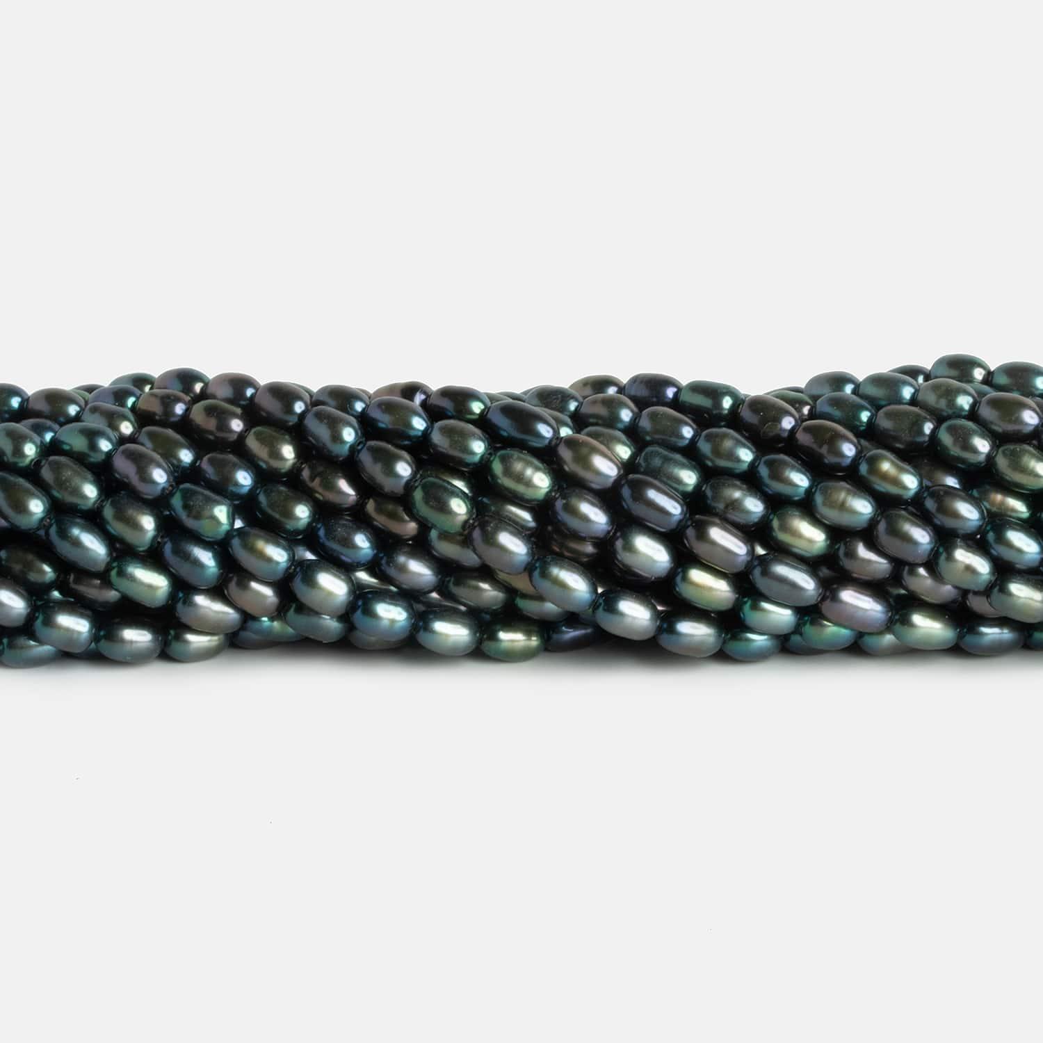 These Peacock Green Oval Freshwater Pearls measure an average of 4x5mm and are strung on a 15-inch strand of approximately 57 beads. Their striking peacock green body color displays a deep, iridescent luster with overtones of blue, teal, and subtle bronze that shift beautifully in the light. The smooth oval shape and radiant nacre give these pearls a refined elegance while maintaining a natural character unique to freshwater pearls.