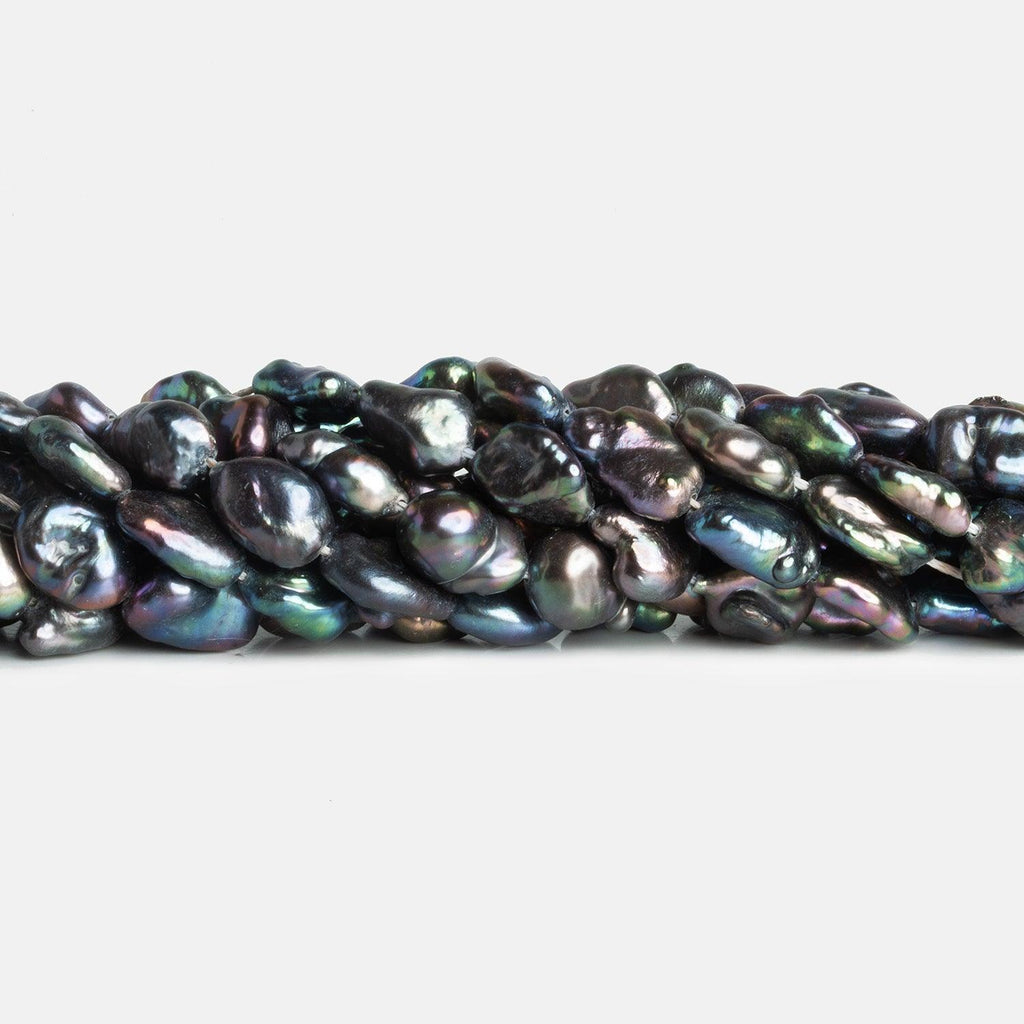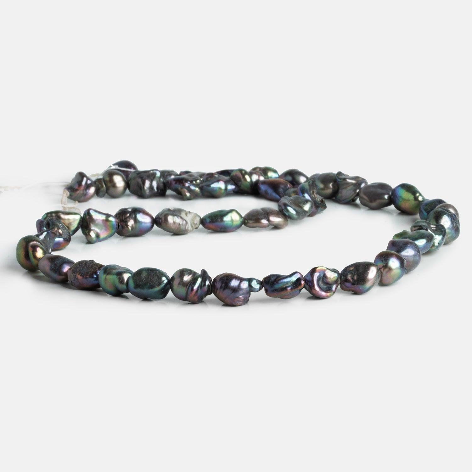 Pearls measure 9x7mm to 12x8mm. These exquisite pearls possess a unique charm, featuring an alluring combination of vibrant peacock hues and a mesmerizing straight-drilled design.