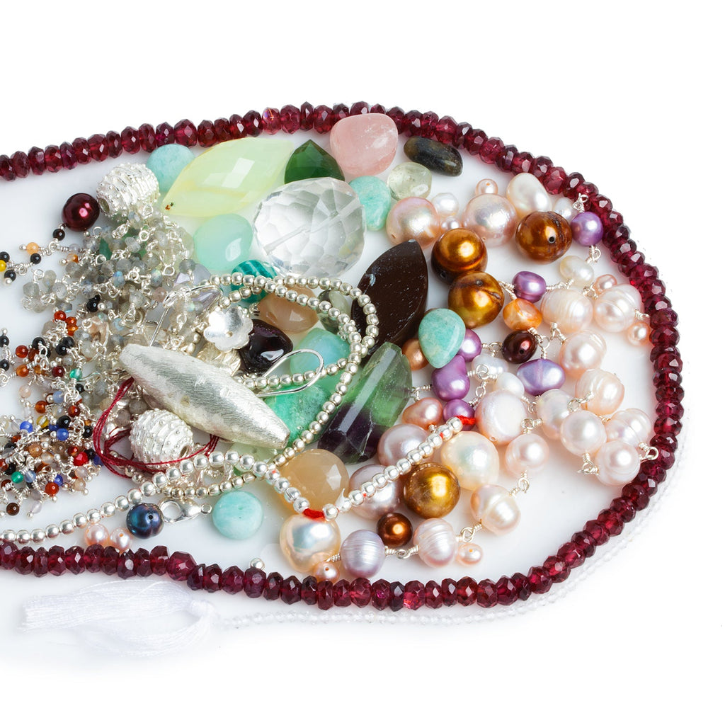 Includes the full assortment of pearls, metals gemstone beads and handwrapped chain seen here.