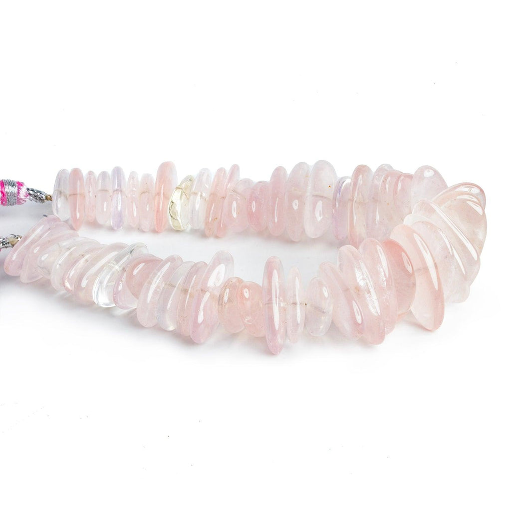 Beads average about 13x10mm to22x11mm. These sleek, smooth polished chip beads are graduated in size and showcase translucent bodies with a pleasant pink color palette.
