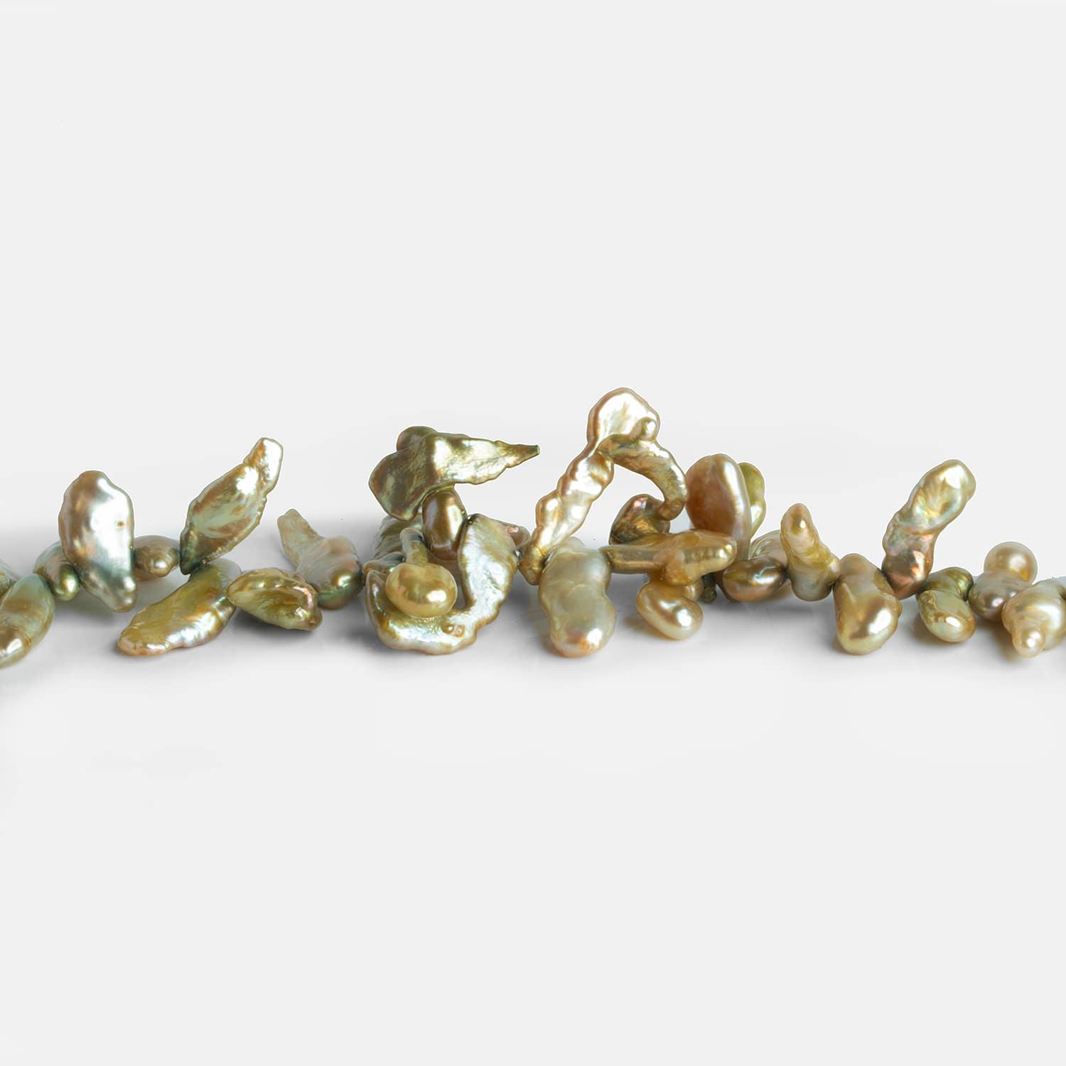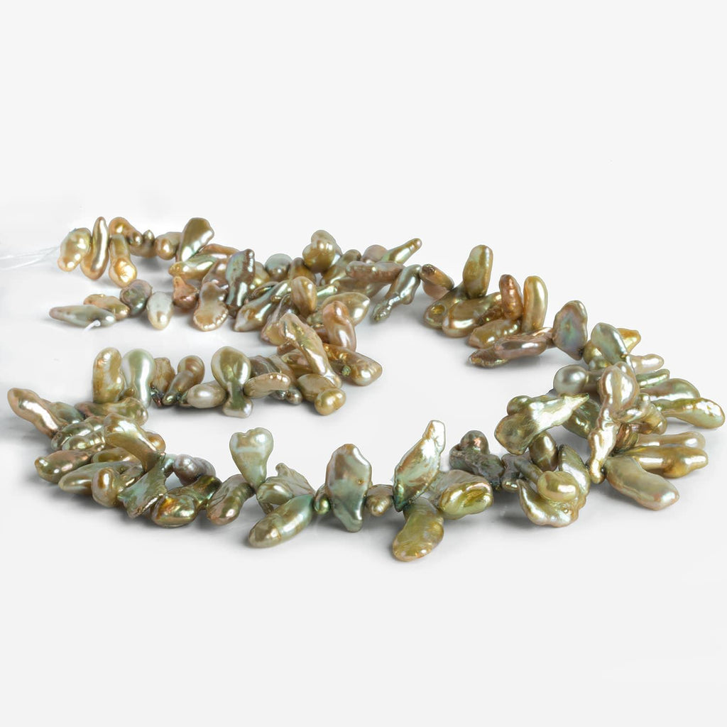 Pearls measure about 10x5mm to 16x7mm. These exquisite pearls have a lovely charm combining pale green & yellow undertones with a myriad of colorful accents.