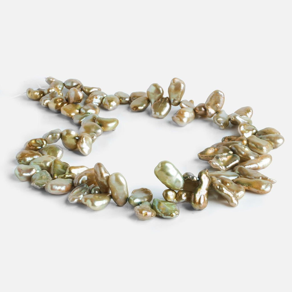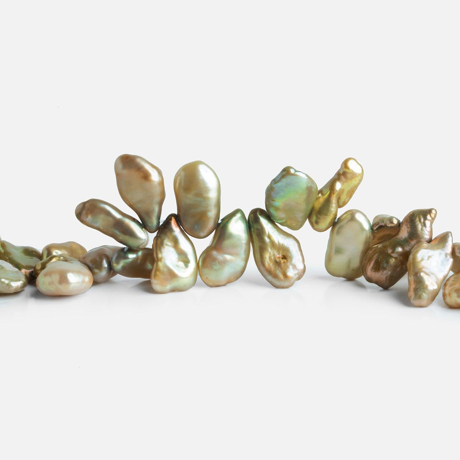 Pearls measure about 10x7mm to 15x9mm. These exquisite pearls have a lovely charm combining pale green & yellow undertones with a myriad of colorful accents.