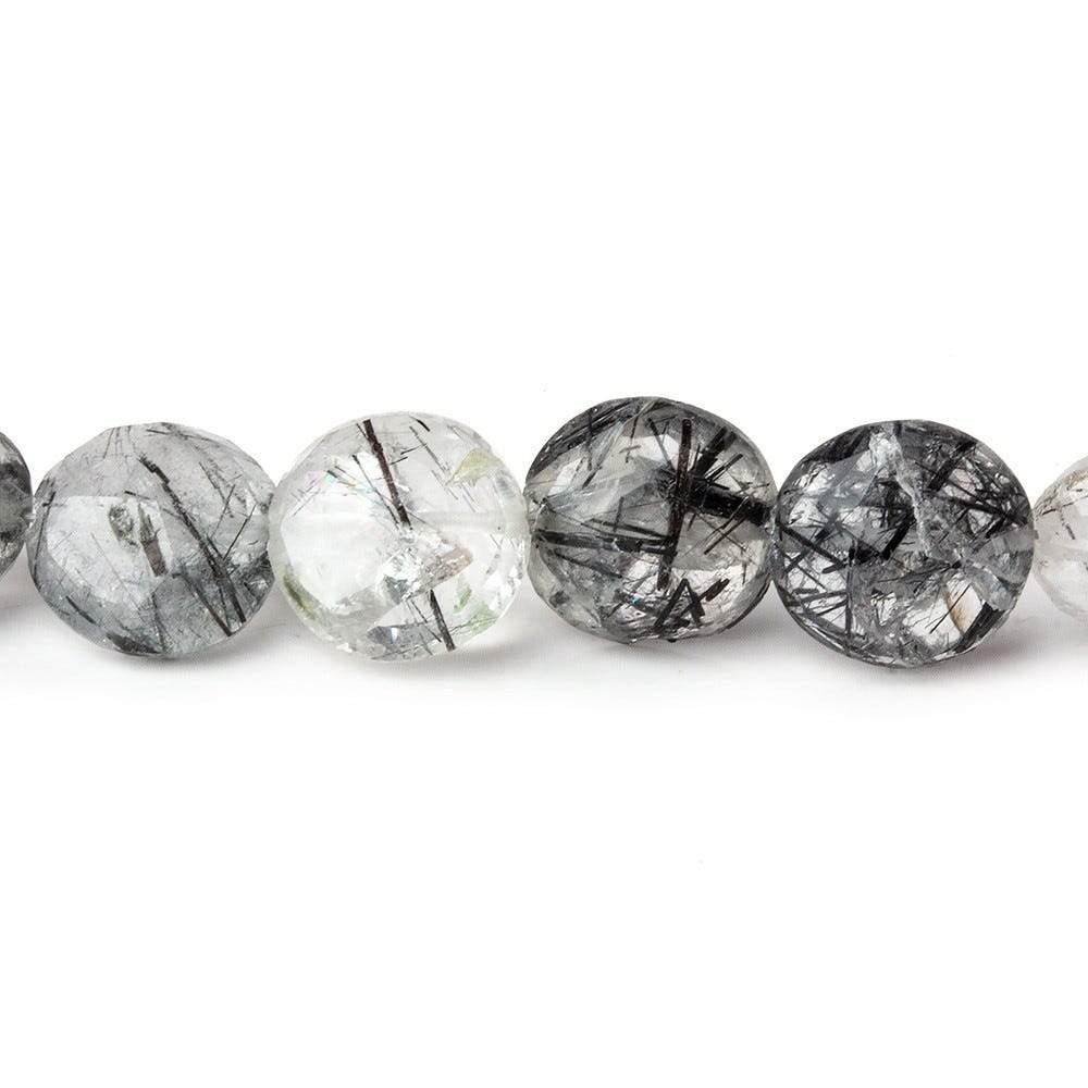 This 10mm Black Tourmalinated Quartz Faceted Coin 8 inch strand contains 22 beads of premium quality. Each coin has a thick and symmetrical shape with a vitreous luster and brilliance, along with heavy internal features and a strong group of Black Tourmaline needles. Enjoy the sparkle and subtle beauty of this natural gemstone.