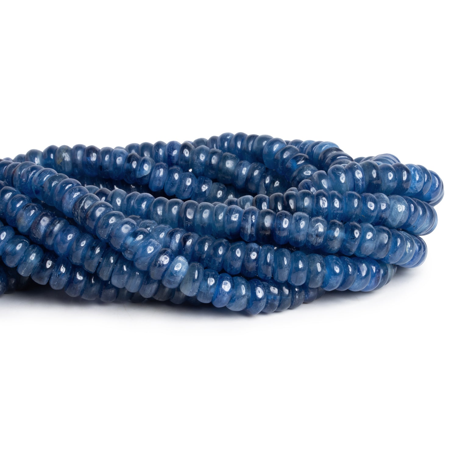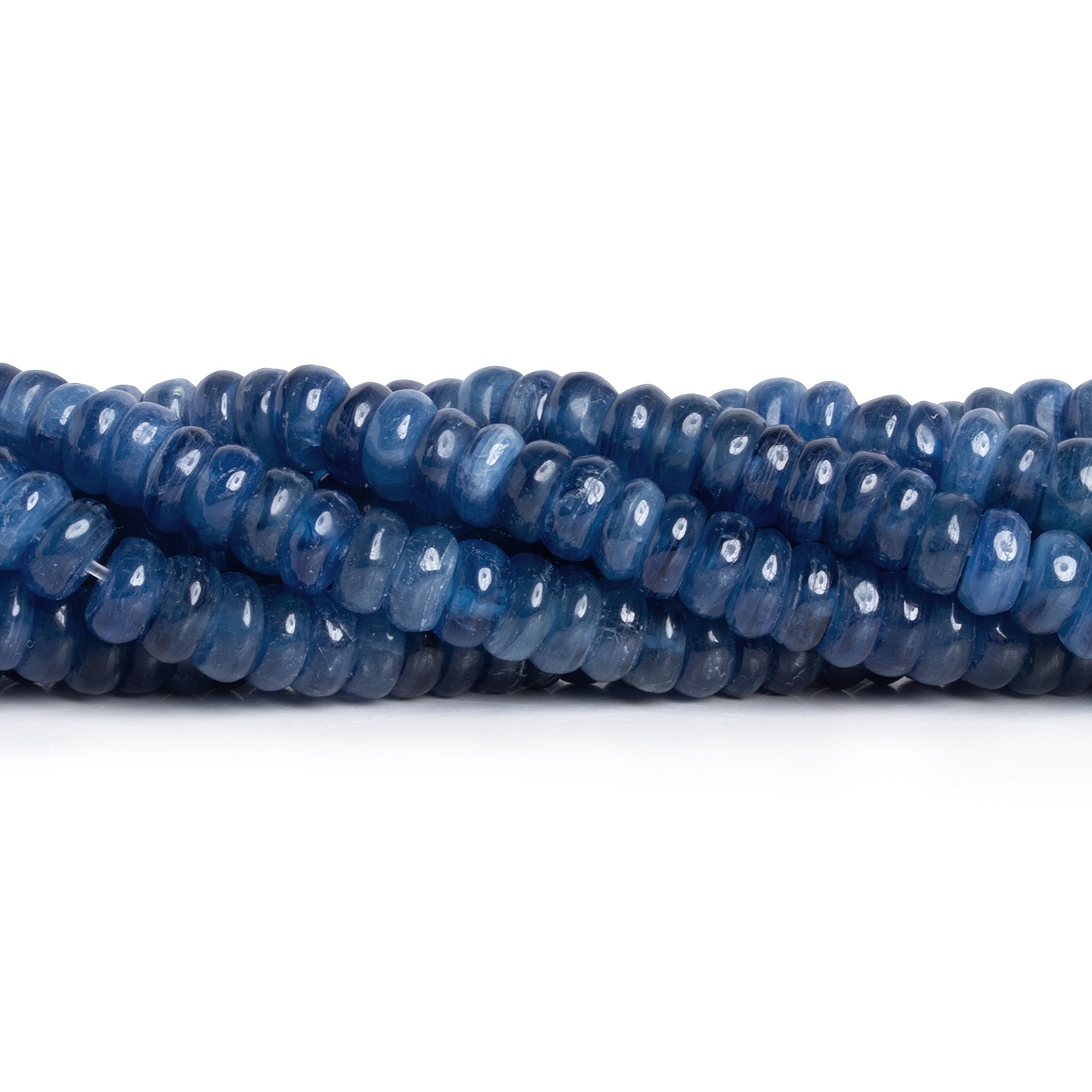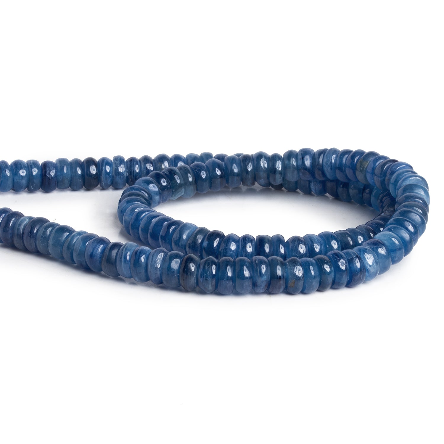 Beads average about 8mm in diameter and are largely consistent across the strand in size & shape. These Kyanite Rondelles have a shape reminiscent of a tire with a deep blue color that comes through dense but translucent bodies. Internal characteristics are evident, but consist of striations parallel to the circumference of the bead. Some beads display a marvelous Cat's Eye effect familiar to fans of Kyanite. Beads include 1mm large drill hole for maximizing versatility in stringing material.