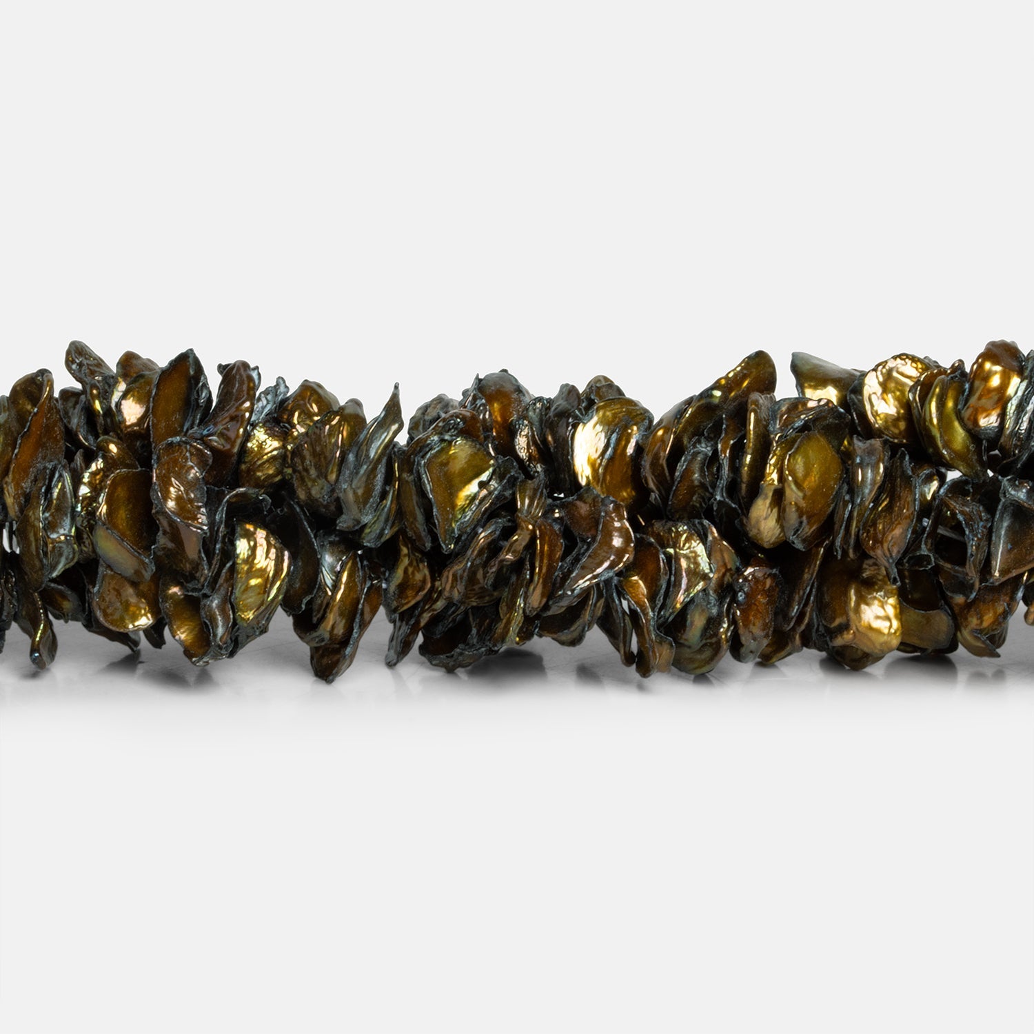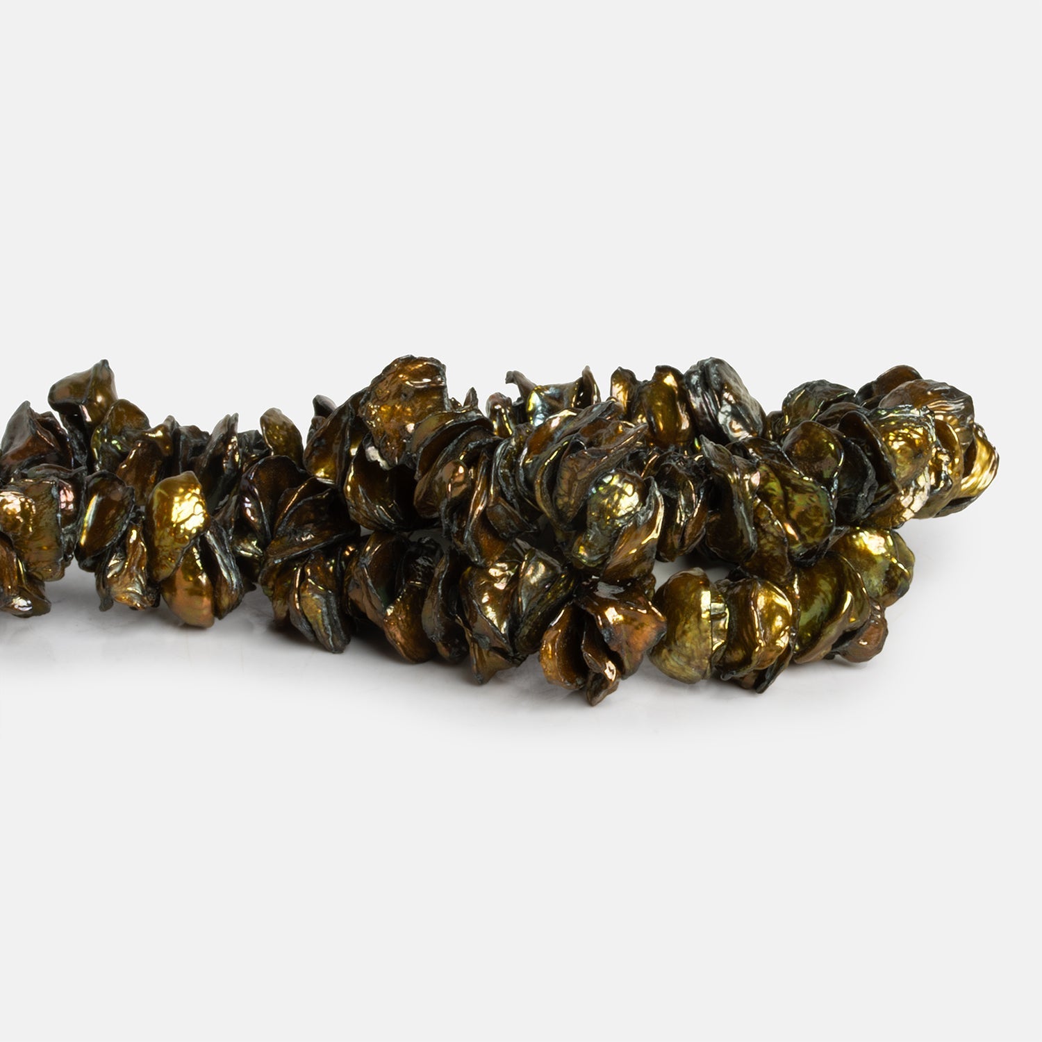 Pearls measure about 10mm in diameter and have a center-drilled orientation. These earthy-hued Keshis show off a range of tones from brassy and coppery to dark green reminiscent of seaweed. Fans of unique pearls should jump on these curated strands, perfect for everything from necklaces to earrings and more.