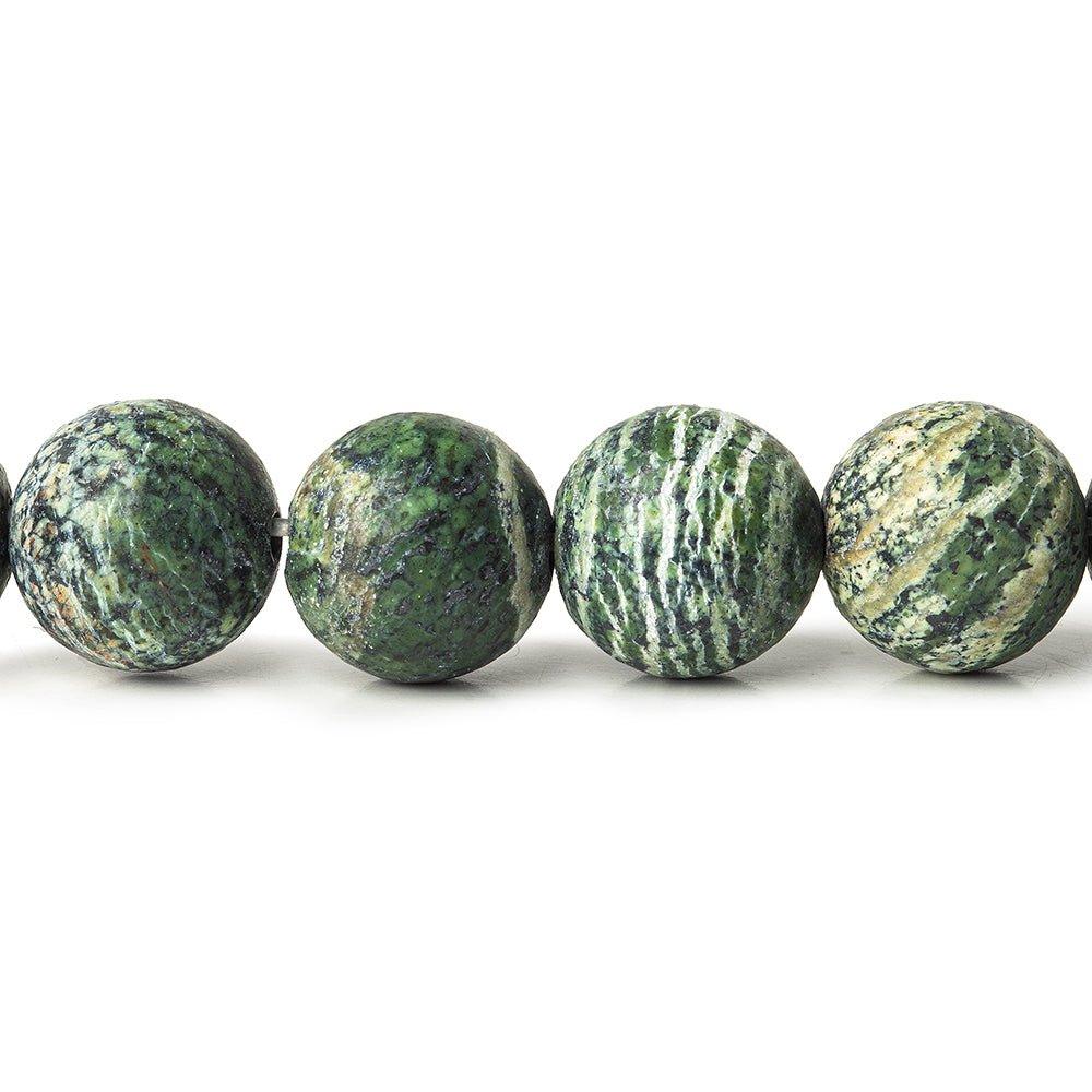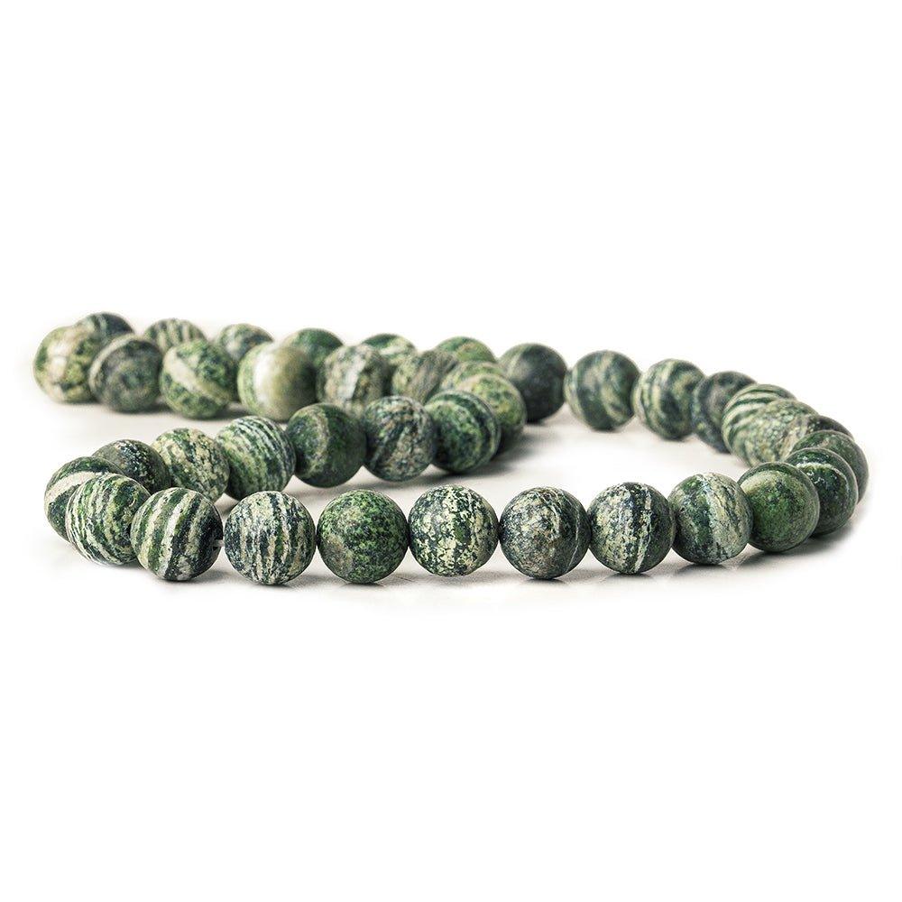 10mm Matte Green Zebra Jasper plain rounds with 1mm diameter Large Drill Hole on the strand measuring 15 inch with 38 beads.