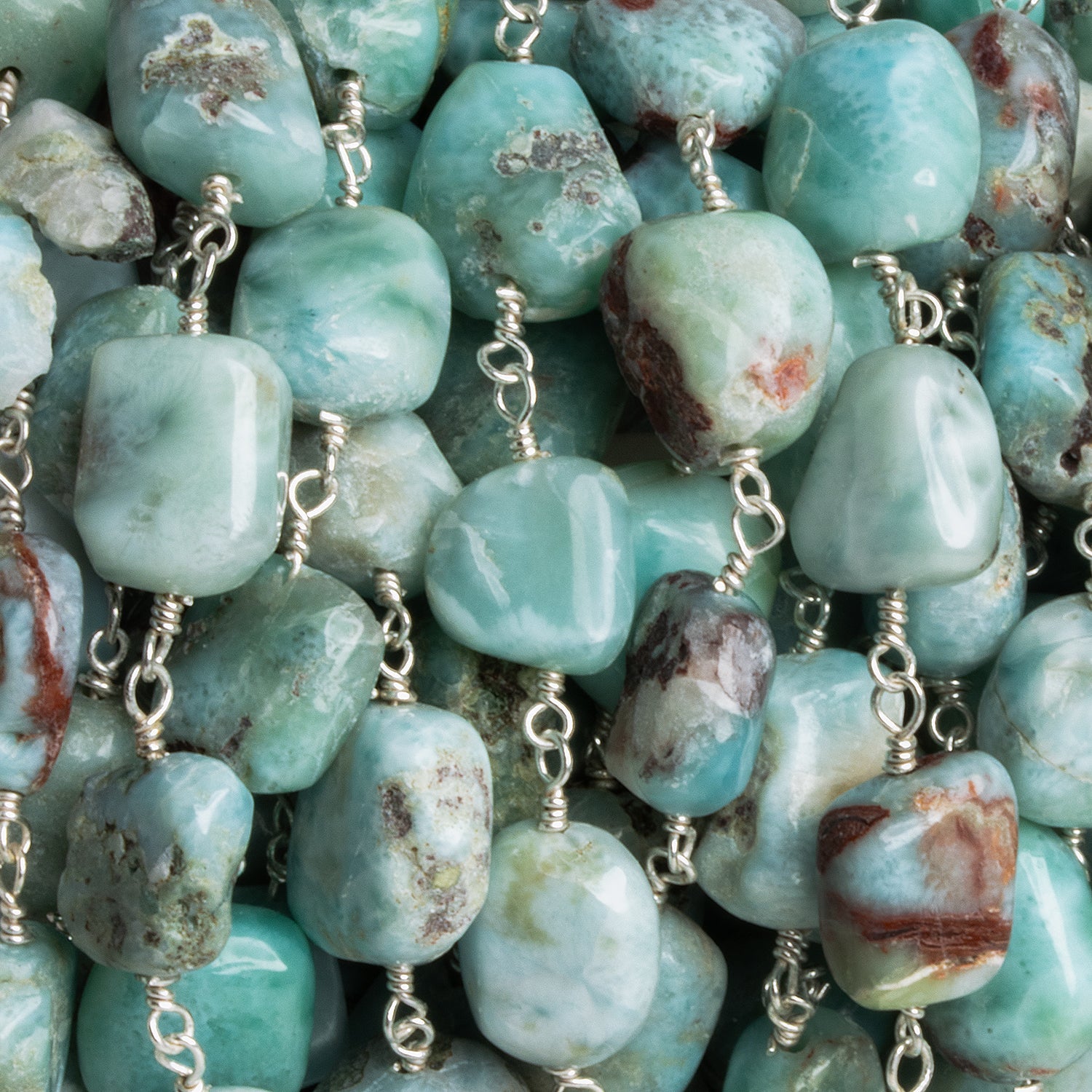 Hand-wrapped in rich silver-finished wire, this chain offers a cool tableau with the dreamy hues of larimar. With approximately 18 beads per foot, it's ideal for statement necklaces, relaxed coastal-inspired pieces, or elegant accents in mixed-gemstone designs. This chain brings calming energy and artisan charm to any jewelry collection.