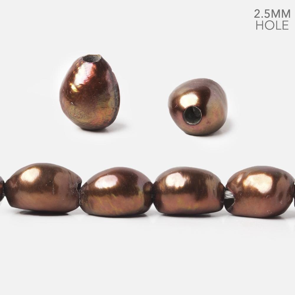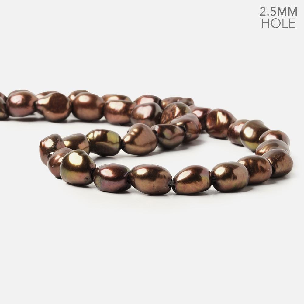 Cinnamon Brown Straight Drilled Baroque Freshwater Pearls measure approximately 11x9mm to 12x10mm in size, the pearls have a high luster showing an `oil in water` Iridescent overtone, pearls have good nacre quality showing very slight surface irregularities, these pearls are well matched for color on strand, pearls are straight drilled, the pearl bodies have a strongly reddish deeply saturated brown body with an iridescent overtone, and these Large Hole Freshwater Pearls are an excellent value for an above average size baroque shape with a 2.5mm hole.