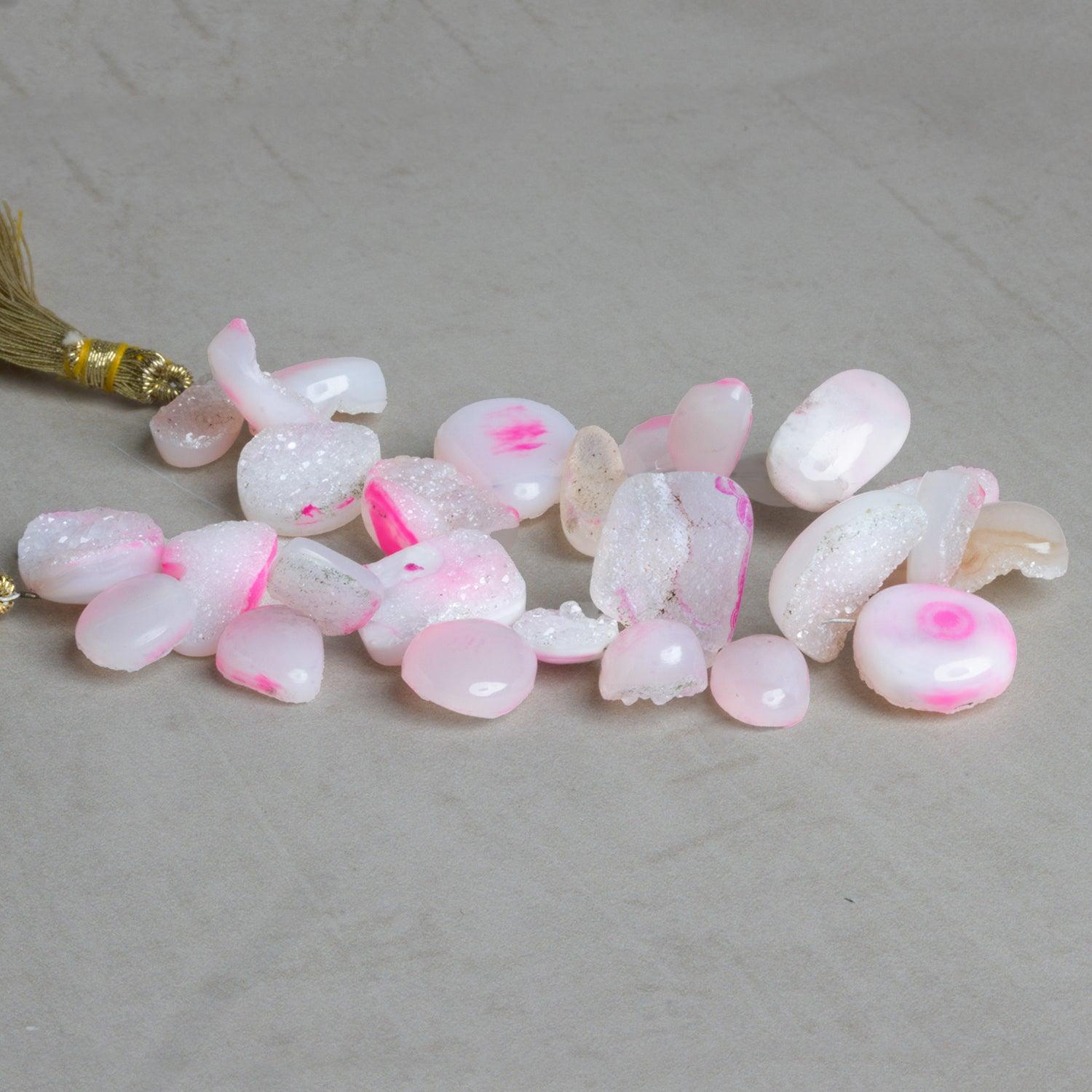 Beads measure from about 8x7mm to 14x13mm. This strand features smooth polished nuggets with one side featuring gorgeous sparkling Drusy. Expect a white to hot pink color palette.