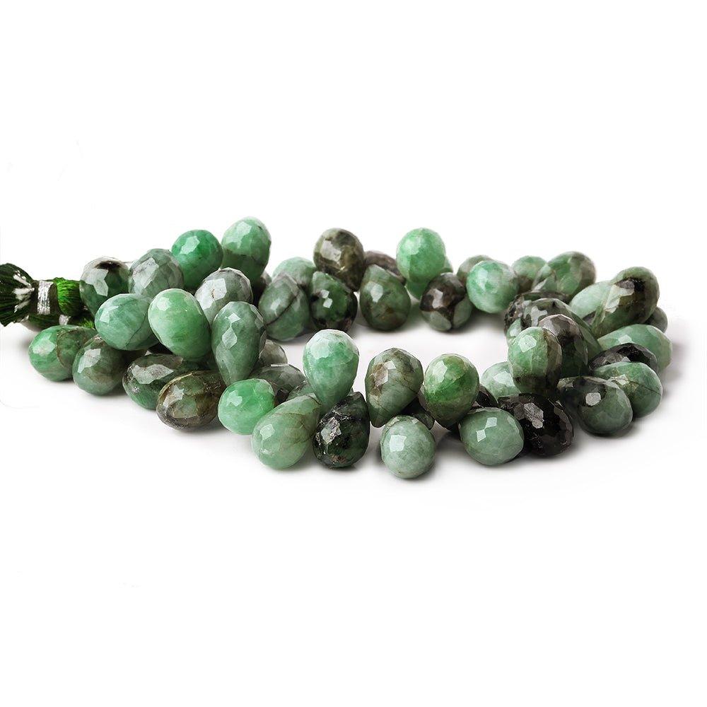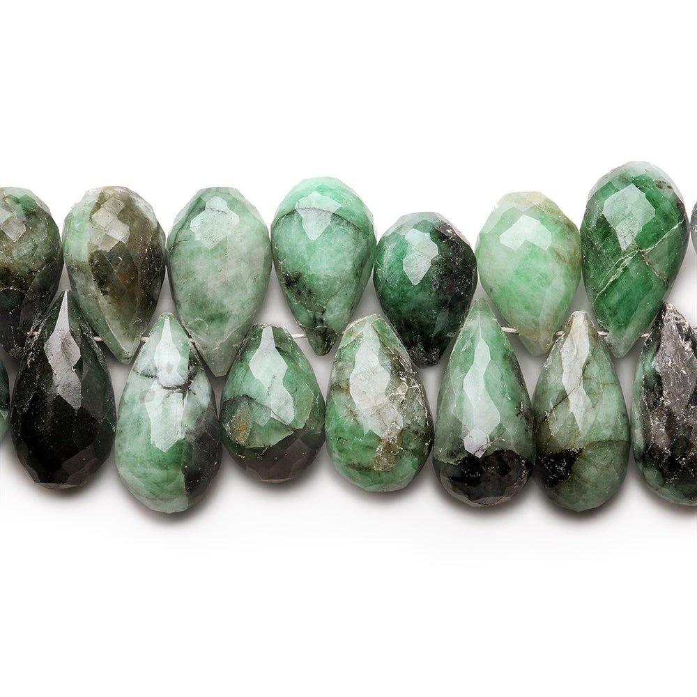 Shaded Emerald Faceted Tear Drop beads having approximately 58 pieces on the 8 inch strand showing vitreous luster with exterior irregularities and some blunt tips.