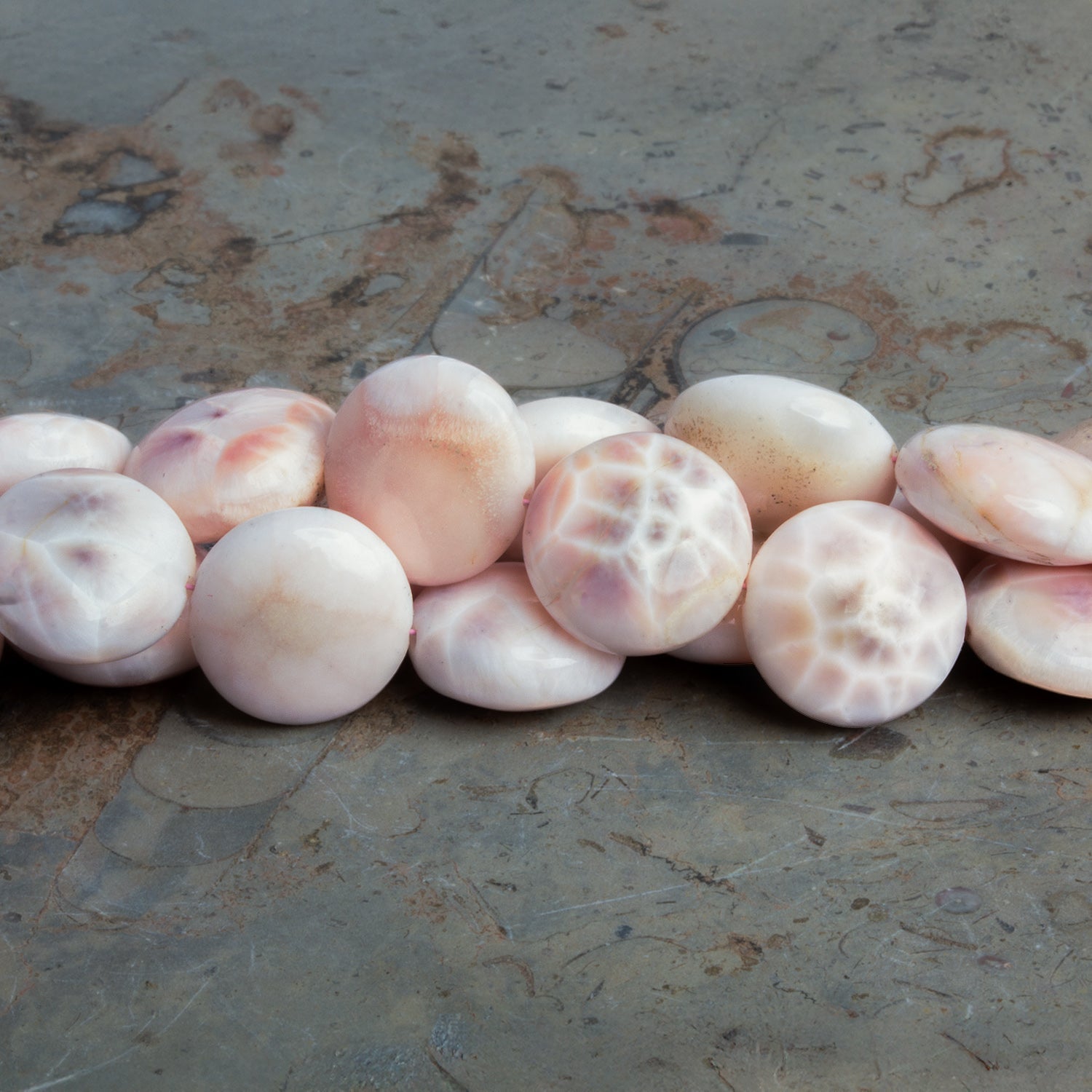 Natrolite is one of those minerals that stops people mid-sentence once they really see it. These smooth, coin-shaped natrolite beads showcase the stone’s signature soft translucence and ethereal internal patterning—often resembling frost, starbursts, or delicate crystalline webs suspended beneath the surface. The palette ranges from creamy white to blush-peach with subtle warmth, giving each bead a quiet glow rather than a flashy shine. Polished to a satin-smooth finish, these coins feel organic and calming in the hand, with natural variations that make every strand visually rich and unmistakably natural.