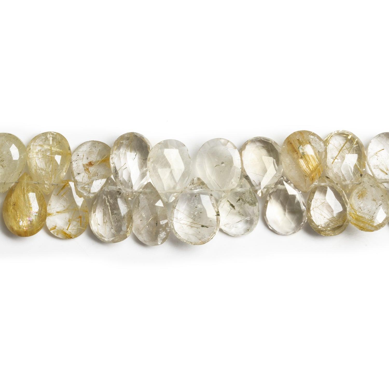 Beads measure about 12x5mm with a couple of mm of variation. These well-crafted pieces feature faceted pear bodies with great clarity and beautiful golden rutile. Fans of the shining sparkle of this gemstone should jump on this curated strand.
