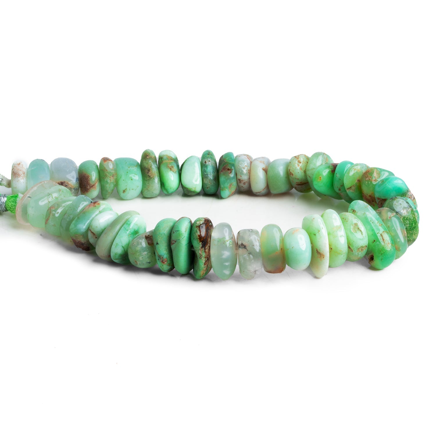 These Chrysoprase Plain Chip Beads, averaging 12x9mm with 30 beads per strand, showcase a rich blend of earthy greens, with some brown matrix and other accent hues. Their organic shapes and polished finish highlight the natural variations in the stone, making each bead unique.