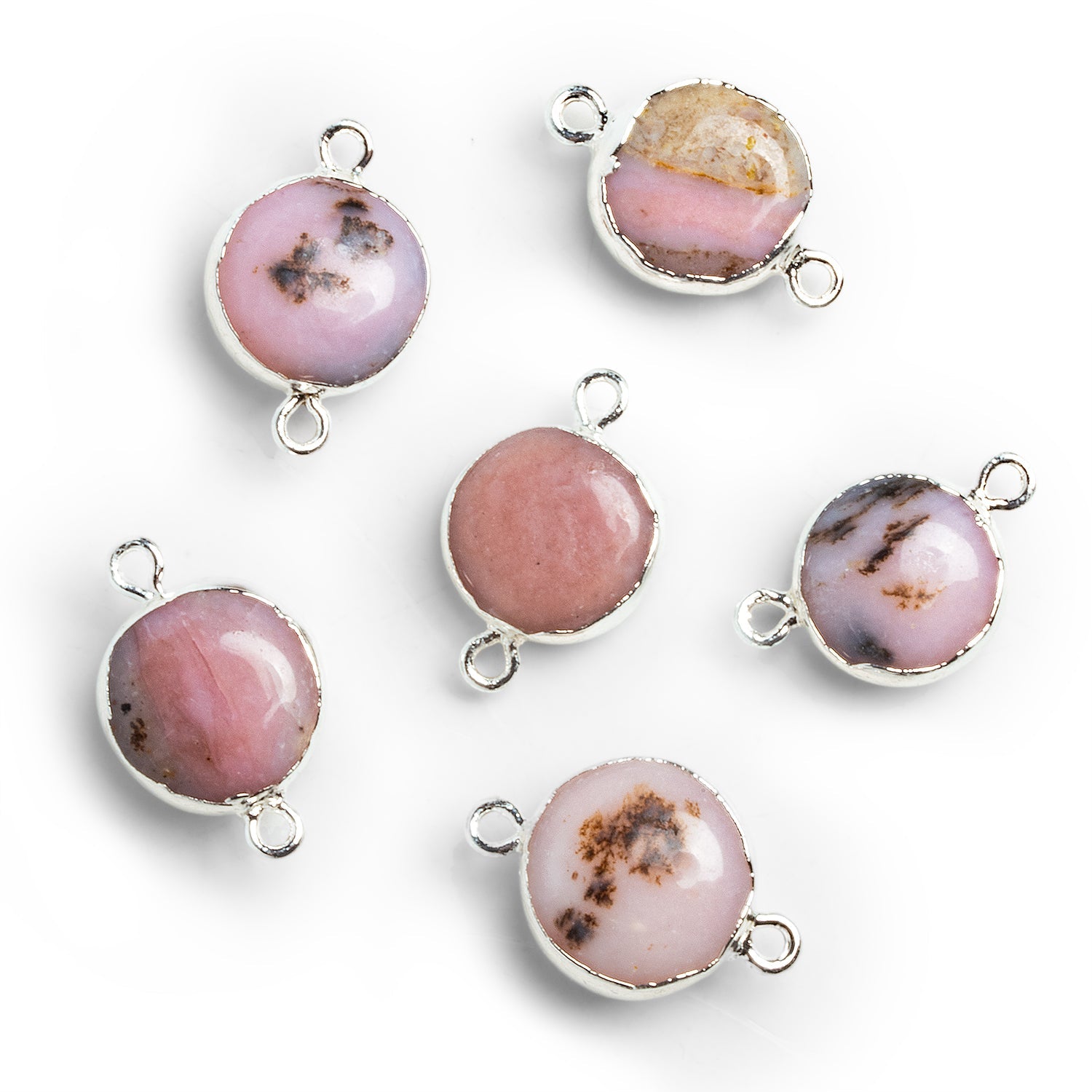 Beads range from about 13mm to 16mm in diameter. These specially curated beauties show off richly colored Pink Peruvian Opal in all of your favorite tones and textures. Our gorgeous offerings look amazing enveloped in our signature silver leaf and are ideal for bringing together a statement Jewelry Design. Imbue your next creation with the beloved mystique of Pink Peruvian Opals, perfect for necklaces, earrings and more.