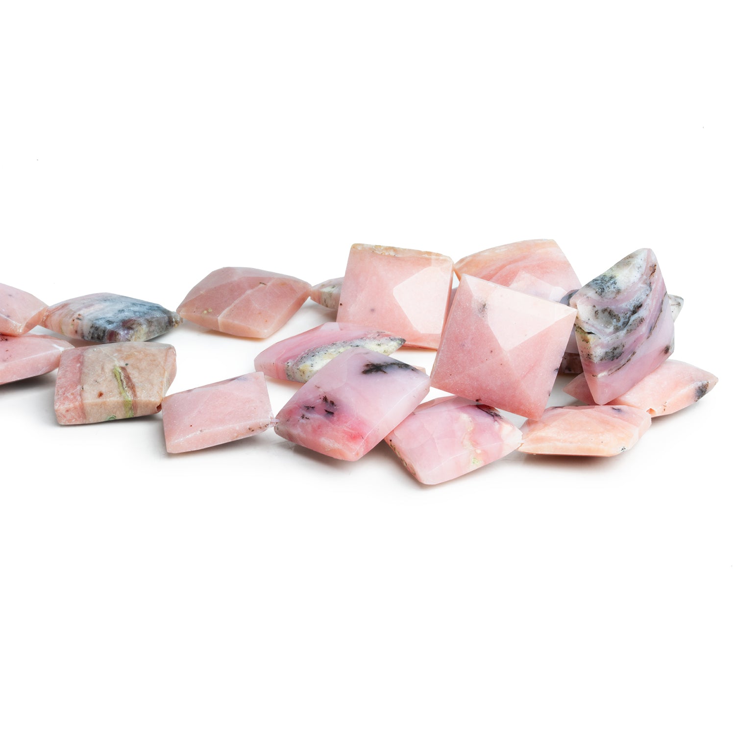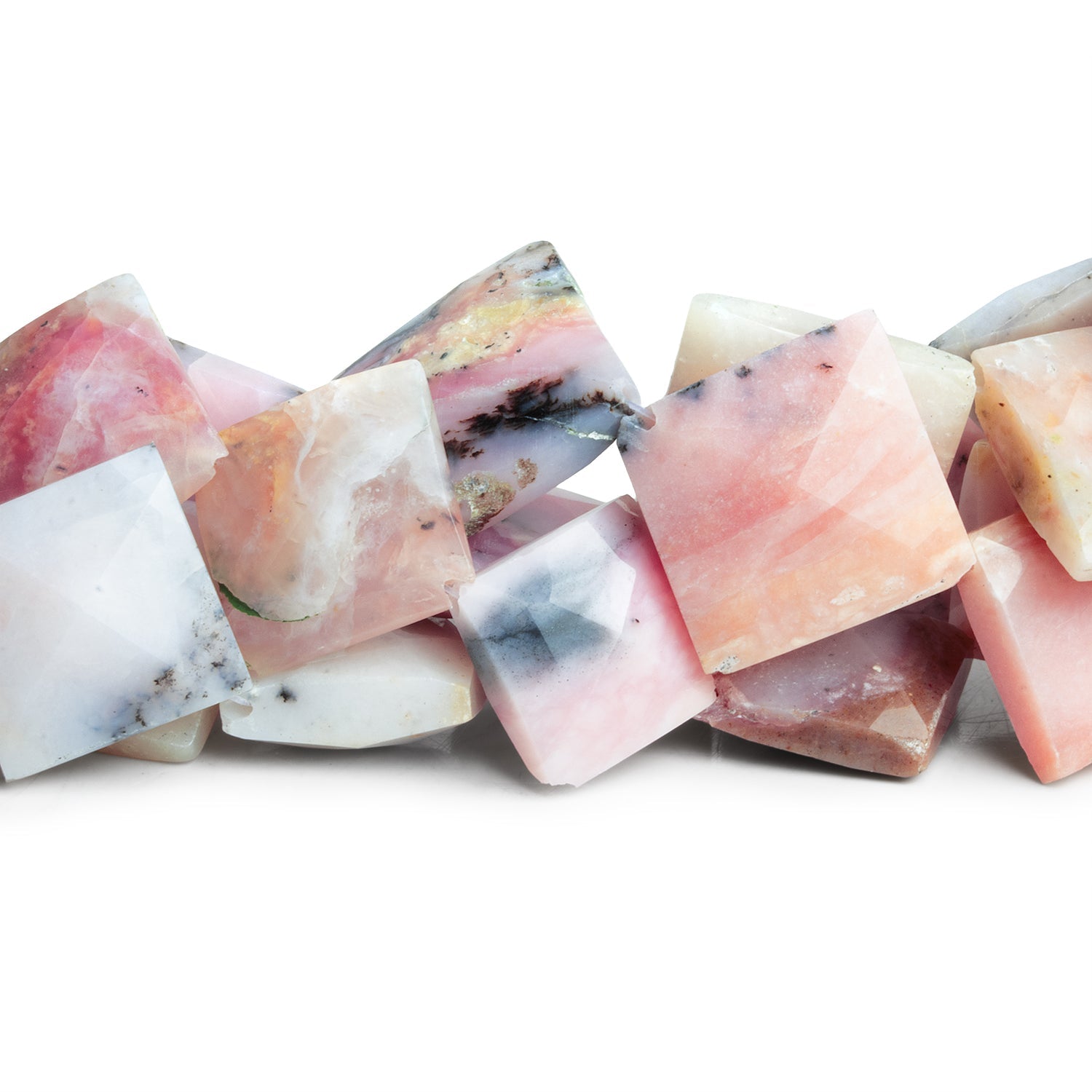 These Pink Peruvian Opal Corner Drilled Square Beads showcase the natural beauty of pastel pink opal with occasional dramatic inclusions and dendritic patterns. Each bead is expertly faceted and corner drilled, giving the strand a distinctive geometric appeal. The stones range from soft blush to richer marbled pinks, accented with earthy grays, creams, and black mineral traces that lend each bead a one-of-a-kind look.
