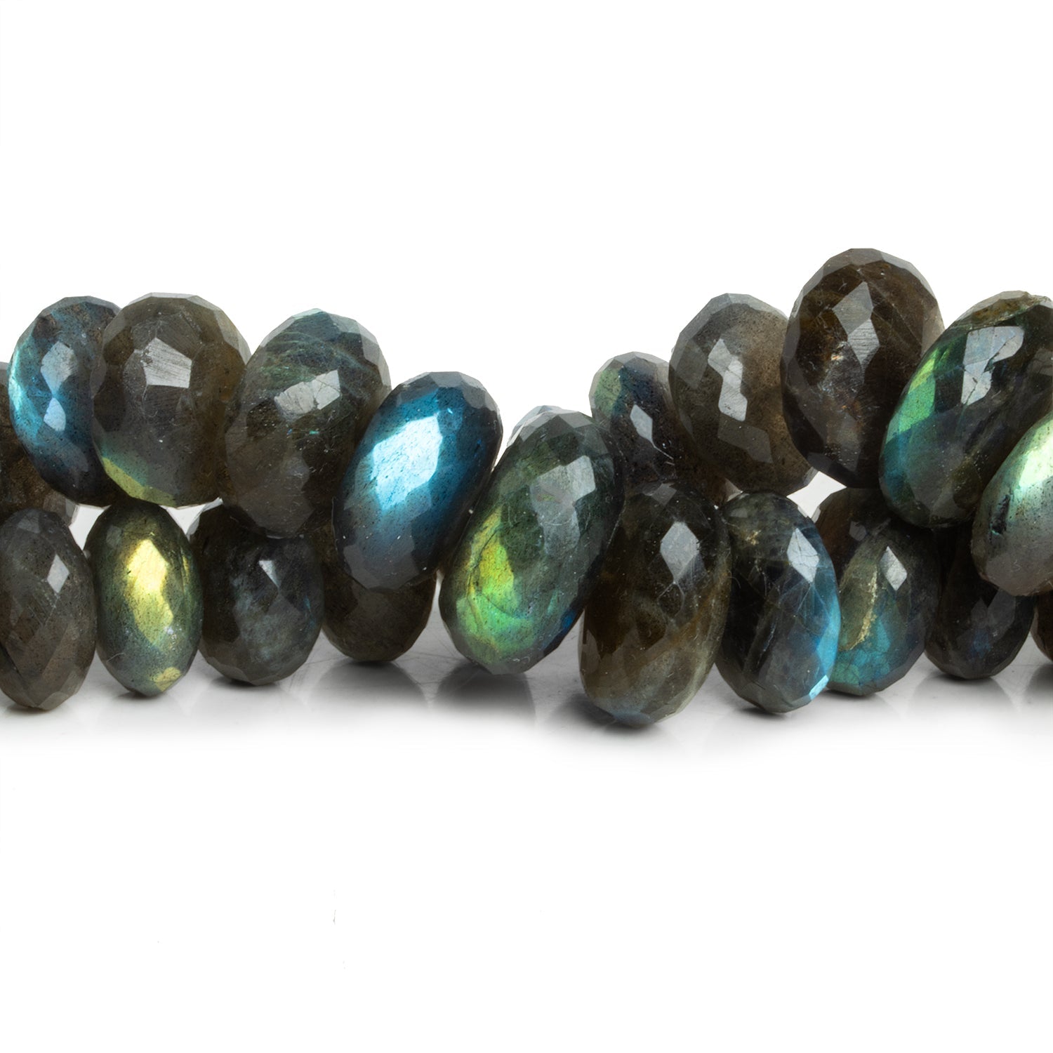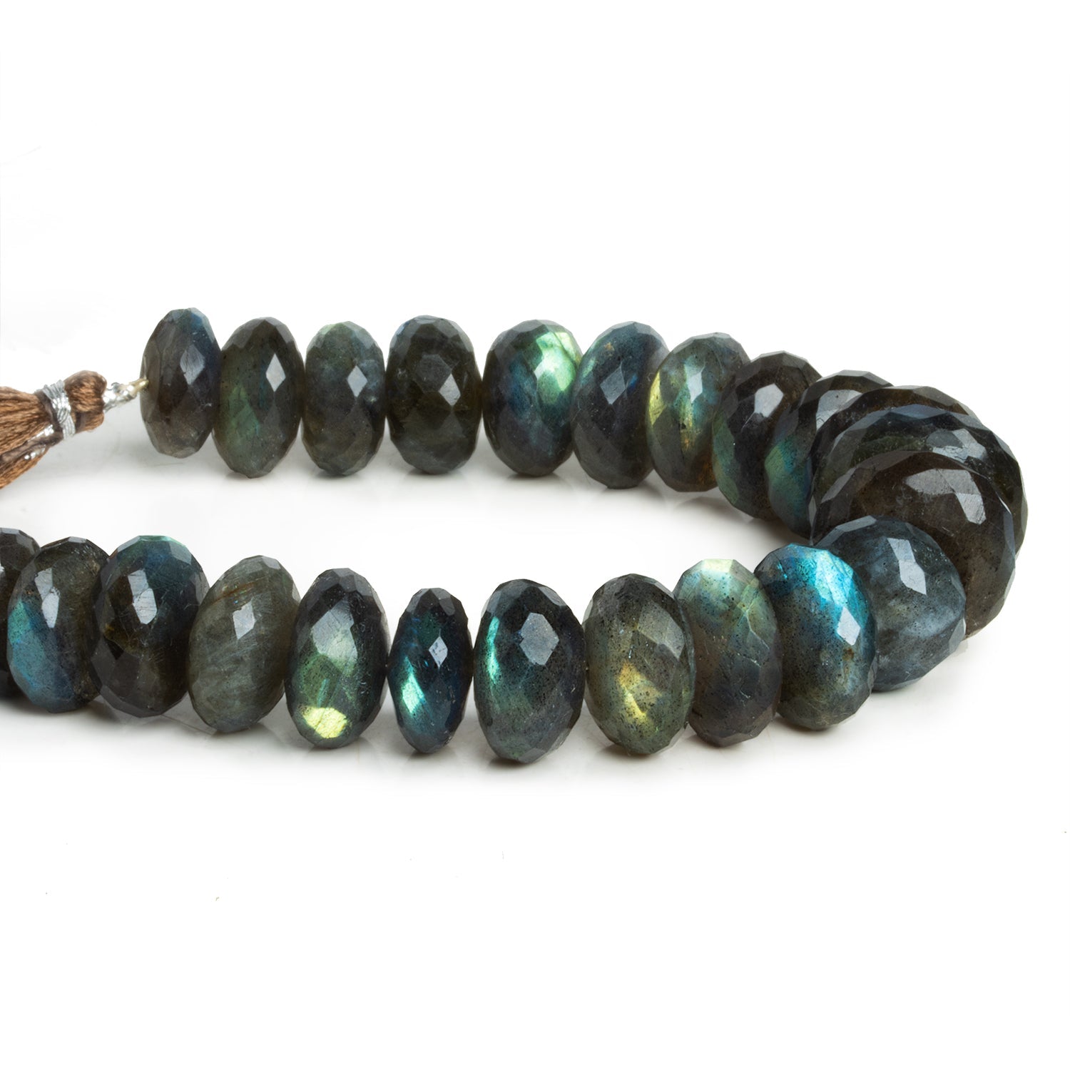 These Labradorite Faceted Rondelle Beads stand out with their impressive size, ranging from 13mm to 20mm in diameter, making them a bold choice for statement jewelry. Expertly faceted, they showcase exceptional quality with a striking play of color, flashing vivid blues, deep teals, and golden-green hues against their smoky gray base. Their substantial size and mesmerizing labradorescence make them ideal for eye-catching designs that exude sophistication and mystery. Each strand includes approximately 23 beads.