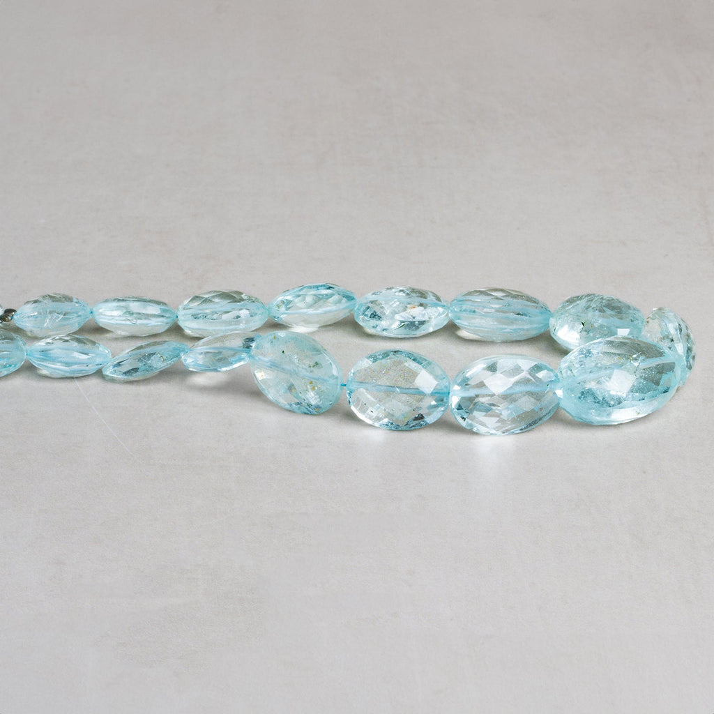 Beads measure about 9x8mm to 17x12mm. These exquisite ovals feature a sophisticated style of faceting that exudes luxury from the surface of clear blue Aquamarine. The light color seen on this specially curated strand represents a delicate, sought-after look that will prove alluring in any Jewelry Design. Our high quality ovals are perfect for use as focal beads in necklaces or earrings as well as mainstays of truly ambitious statement pieces.