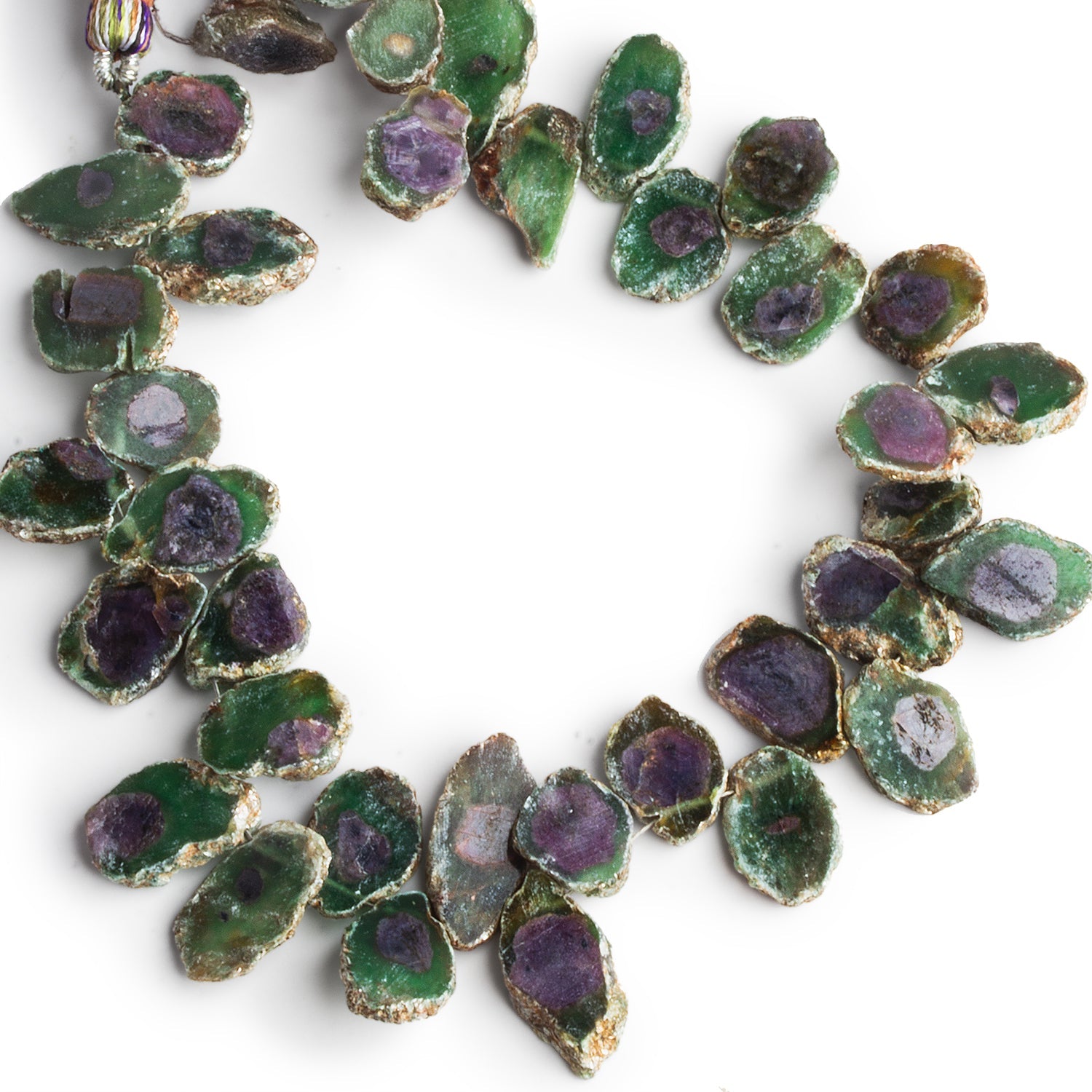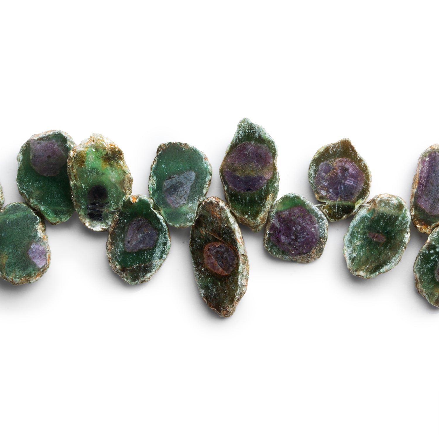 Explore the one-of-a-kind beauty of this specially curated corundum slice offering. Each bead features a mingling of green Sapphire and purple-red Ruby in a thin and organically shaped slice capable of capturing hearts as a focal piece. Their rich hues and polished appearance gives them a luxurious appearance that is perfectly balanced by this naturalistic bead shape. Design with these eye-catching pieces that will fair well combined with most metals and colors, versatile for all occasions.