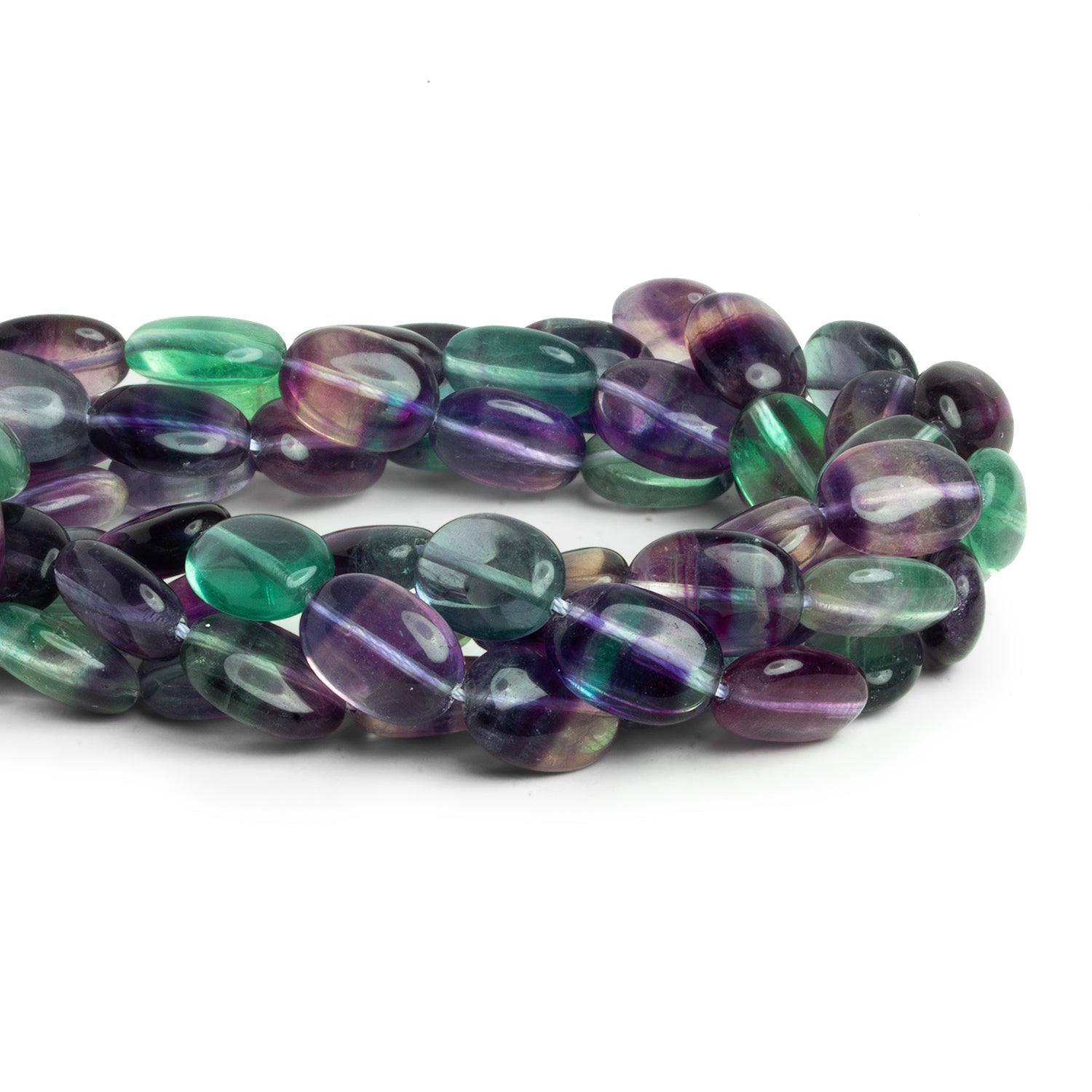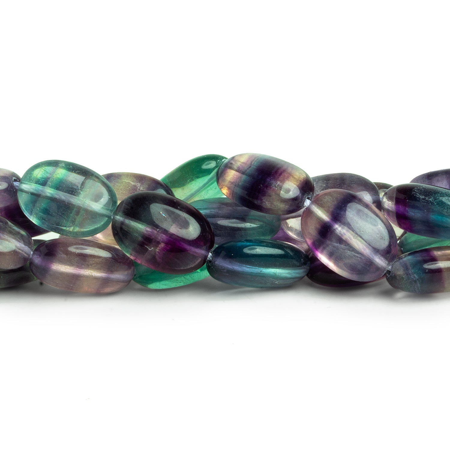 These Fluorite Plain Ovals showcase classic rainbow fluorite at its most wearable — smooth, luminous, and beautifully translucent. Each bead carries shifting bands of emerald green, violet, deep indigo, and soft clear zones that feel both earthy and jewel-like at the same time. The simple oval silhouette keeps the focus on the color play, making these ideal as statement centerpieces, repeating patterns in strands, or refined spacer accents in more complex designs.