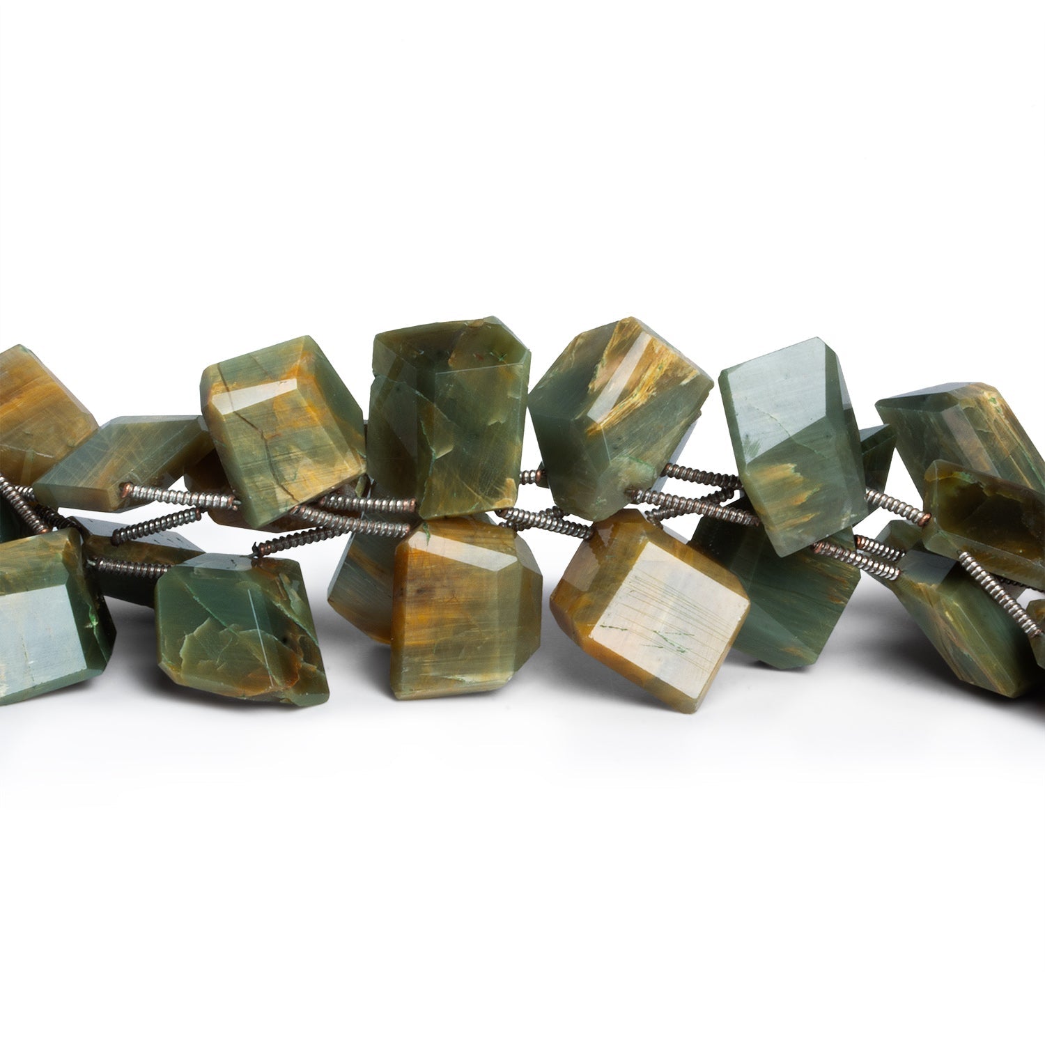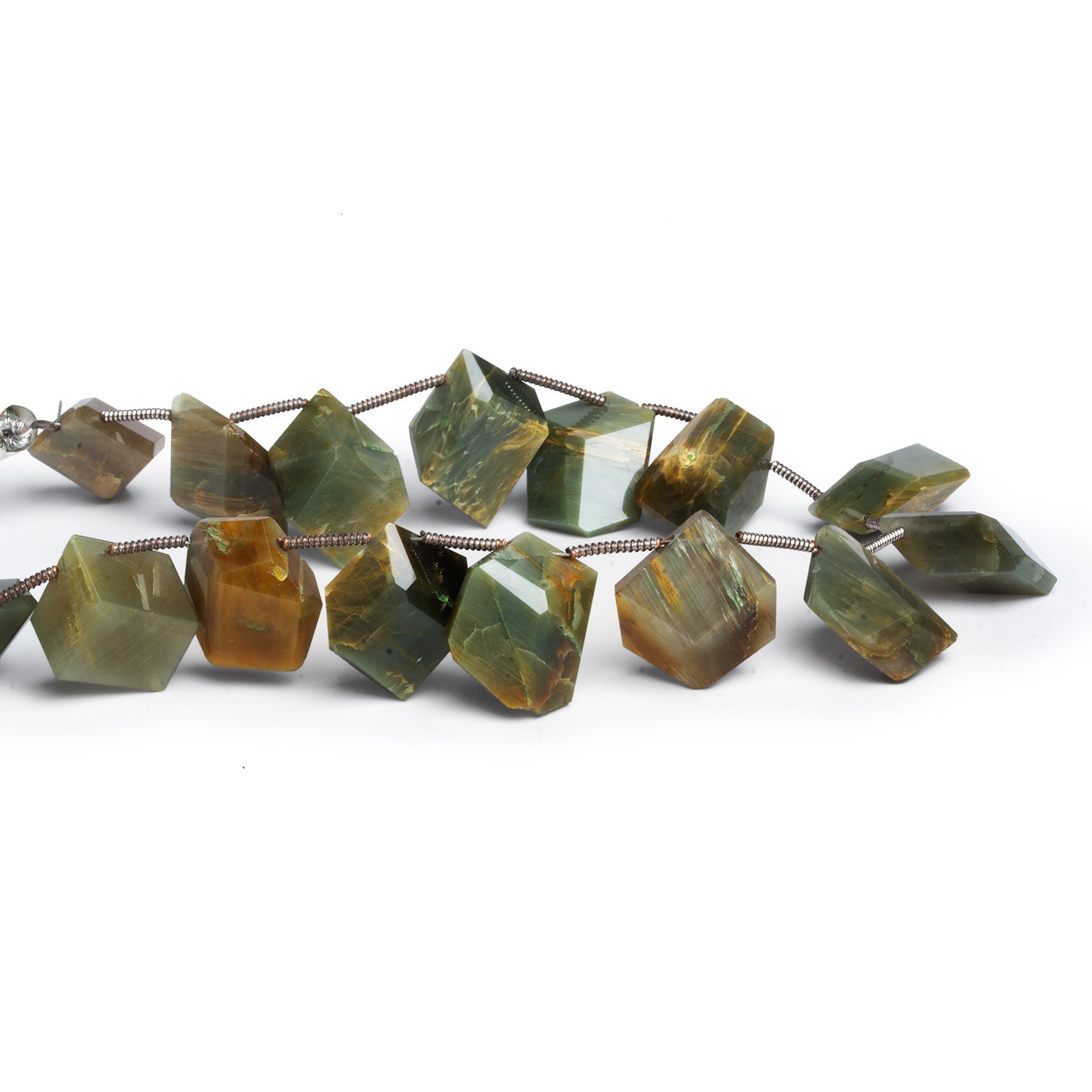 These cat’s eye quartz fancy shape beads feature softly angular silhouettes cut in a range of organic, geometric forms, each one highlighting the stone’s signature chatoyancy. Subtle bands of light glide across layered green tones with warm flashes of olive, sage, and golden undertones, giving the beads a sense of depth and motion as they catch the light. The faceted surfaces enhance this effect without overpowering the silky, optical character that defines cat’s eye quartz.