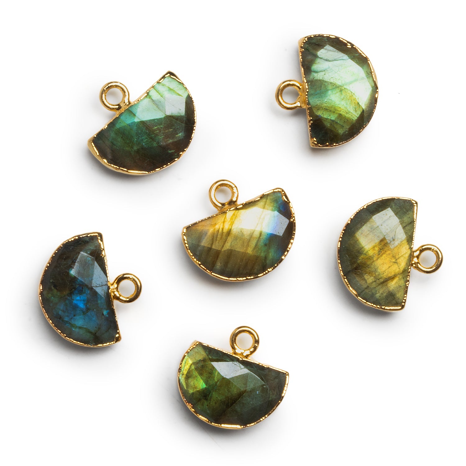 Beads measure about 15x13mm. These colorful pendant pieces feature high-quality Labradorite whose facets sparkle with a wide range of hues. Enveloped in our gold leaf, these alluring designs are sure to catch the eye as the focal bead of necklaces, as earrings, and more!