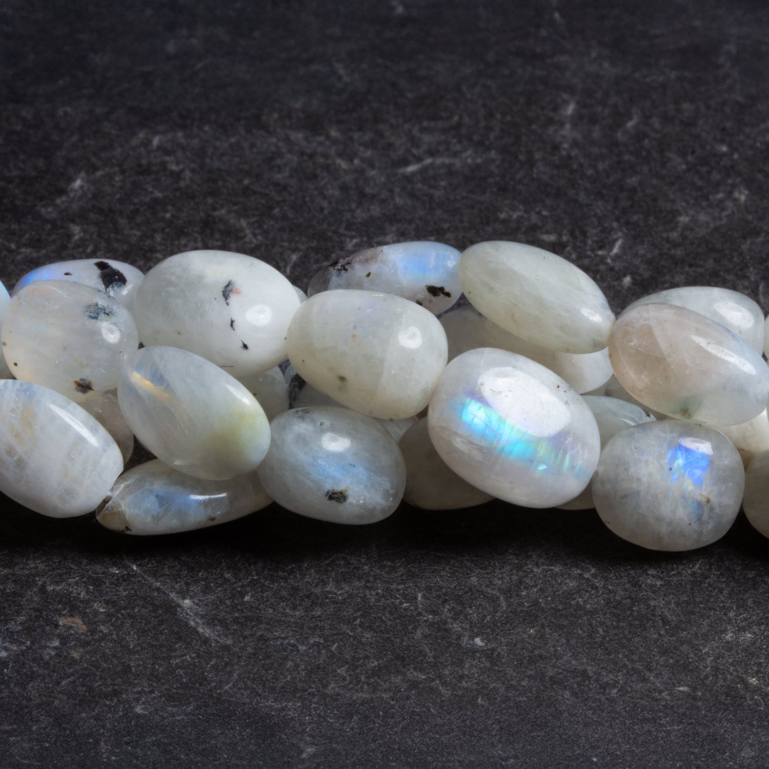 These Rainbow Moonstone Plain Oval Nuggets bring out the ethereal beauty of this luminous gemstone in its most natural and organic form. Each nugget, measuring approximately 10x9mm to 22x12mm, displays a smooth, polished surface that highlights the stone’s milky translucence and flashes of iridescent blue and rainbow sheen. Their freeform oval shapes offer a unique, handcrafted appeal, making every bead one-of-a-kind.