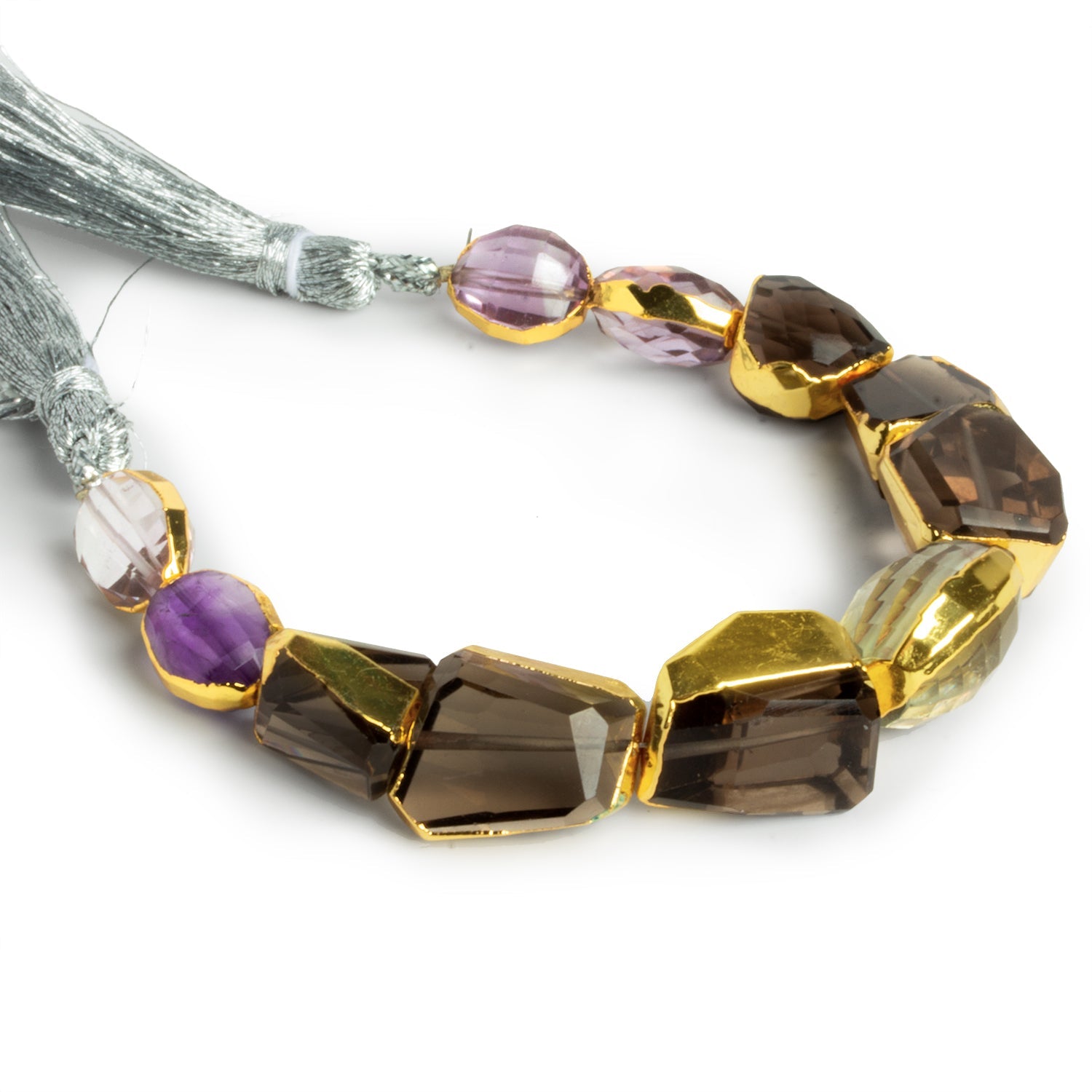 Elevate your designs with the dazzling brilliance of these Gold Leafed Multi Gemstone Strands. Each faceted bead is wrapped in rich golden leafing, creating a luxurious frame that enhances the natural beauty of the gemstones. Featuring a vibrant mix of smoky quartz, amethyst, rose quartz, prasiolite, and citrine, these strands bring together a symphony of soft pastels and deep, earthy tones for a striking yet balanced palette. With bead sizes ranging from 10x8mm to 21x15mm, every strand offers an array of versatile shapes that catch the light beautifully. Ideal for statement necklaces, elegant bracelets, or unique focal pieces, these strands combine artisan craftsmanship with the timeless appeal of genuine gemstones, making them the perfect choice for bold, eye-catching jewelry creations.