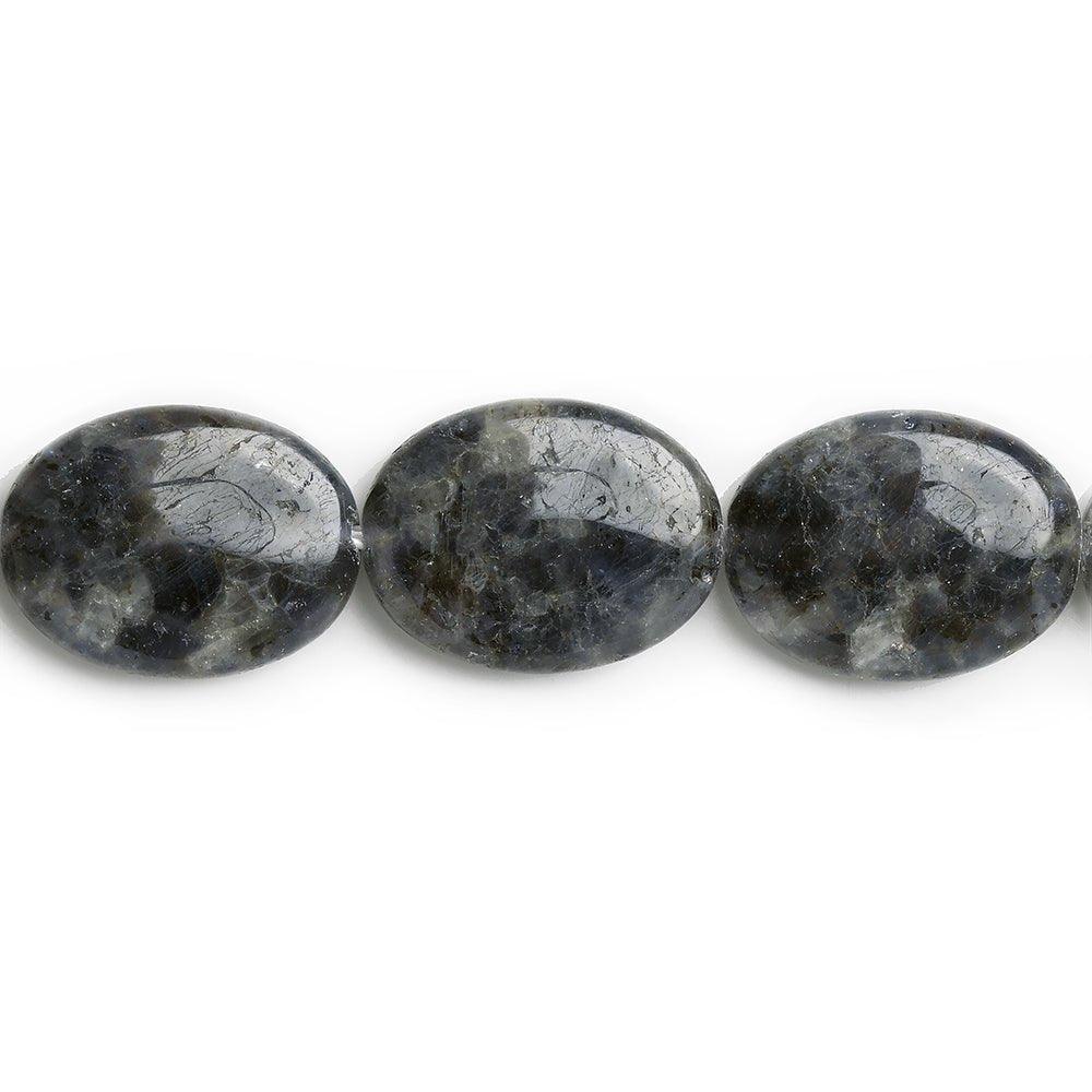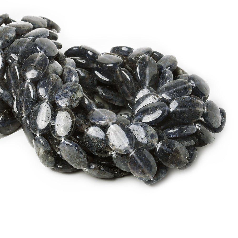 16x12x5mm Iolite straight drilled plain oval strand measuring 15.5 inches in length with approximately 25 beads. These are natural Iolite with moderate internal characteristics and have an opaque to transparent.