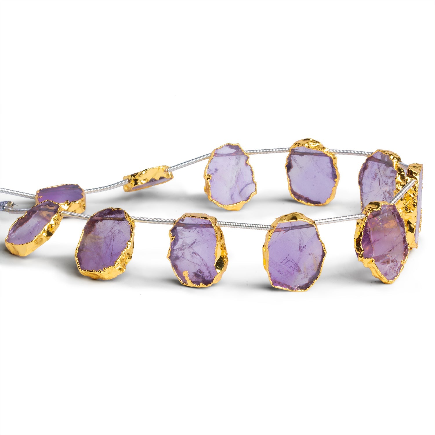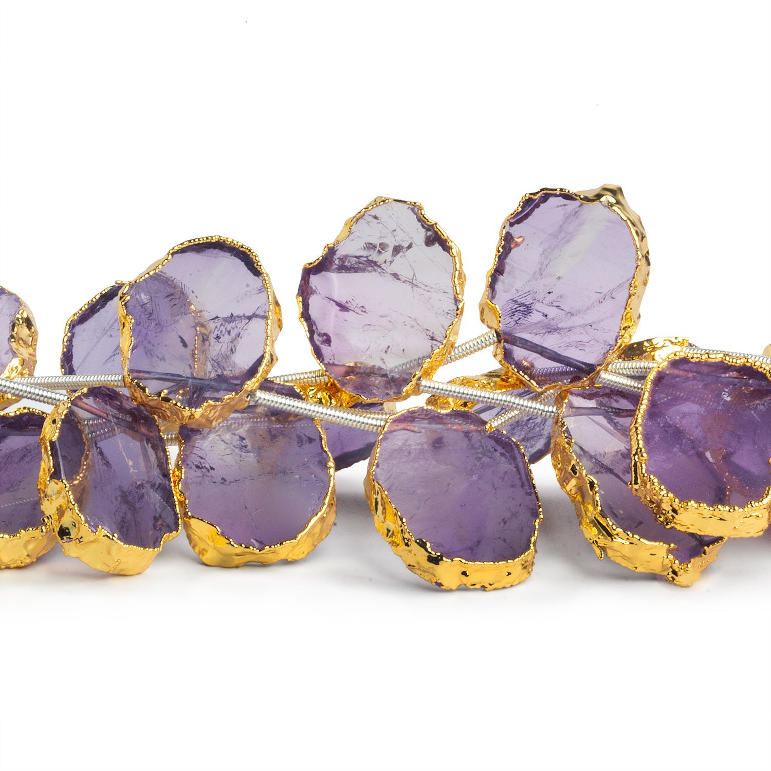 These Gold Leafed Amethyst Straight-Drilled Slices feature softly irregular, naturally cut amethyst with a translucent lavender to light violet hue, accented by organic internal veils and crystalline textures that make each piece unmistakably unique. The freeform slice shapes preserve the raw elegance of the stone, while the hand-applied gold leaf edging adds a refined contrast that enhances the natural color without overpowering it. Subtle variations in tone, thickness, and outline give these beads an artisanal, one-of-a-kind feel that works beautifully in elevated, design-forward jewelry.