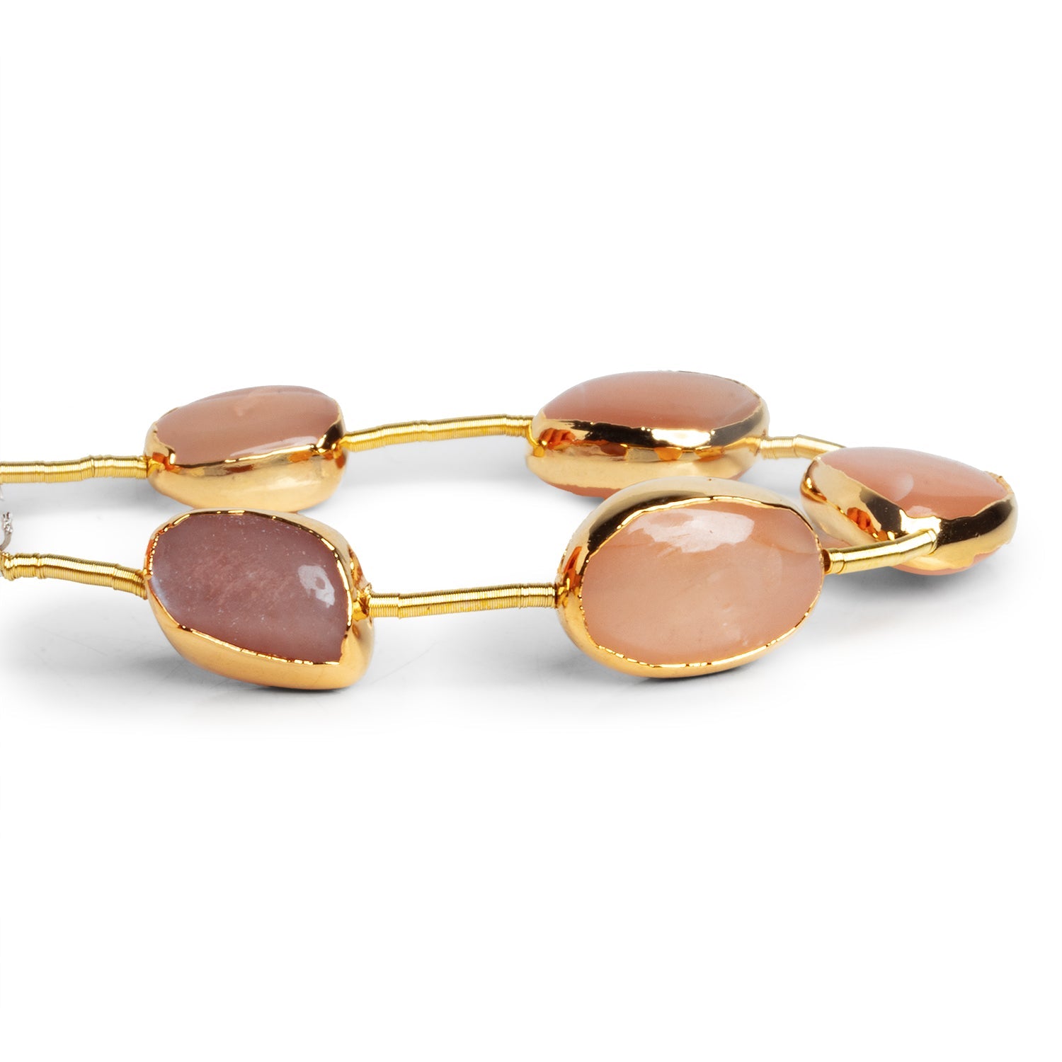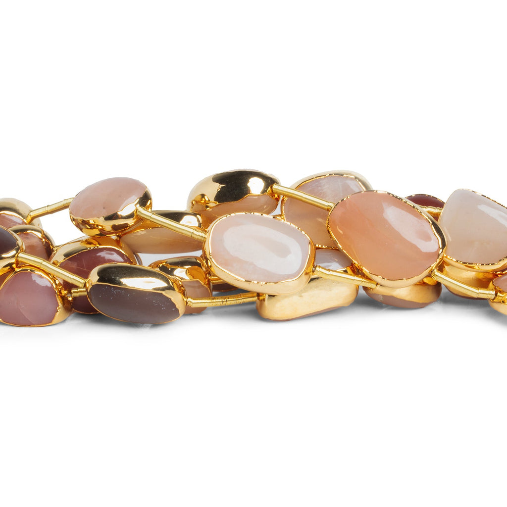 Beads range from about 13x10mm to 22x16mm. These beautiful strands show off a range of warm, peachy tones brimming with Moonstone flash on milky bead bodies. Our smooth polished pieces are enveloped in our signature gold leaf to stunning effect. Imbue your designs with the modern mystique of Moonstone when you use these beauties, ideal for use as focal beads in necklaces, earrings and much more.