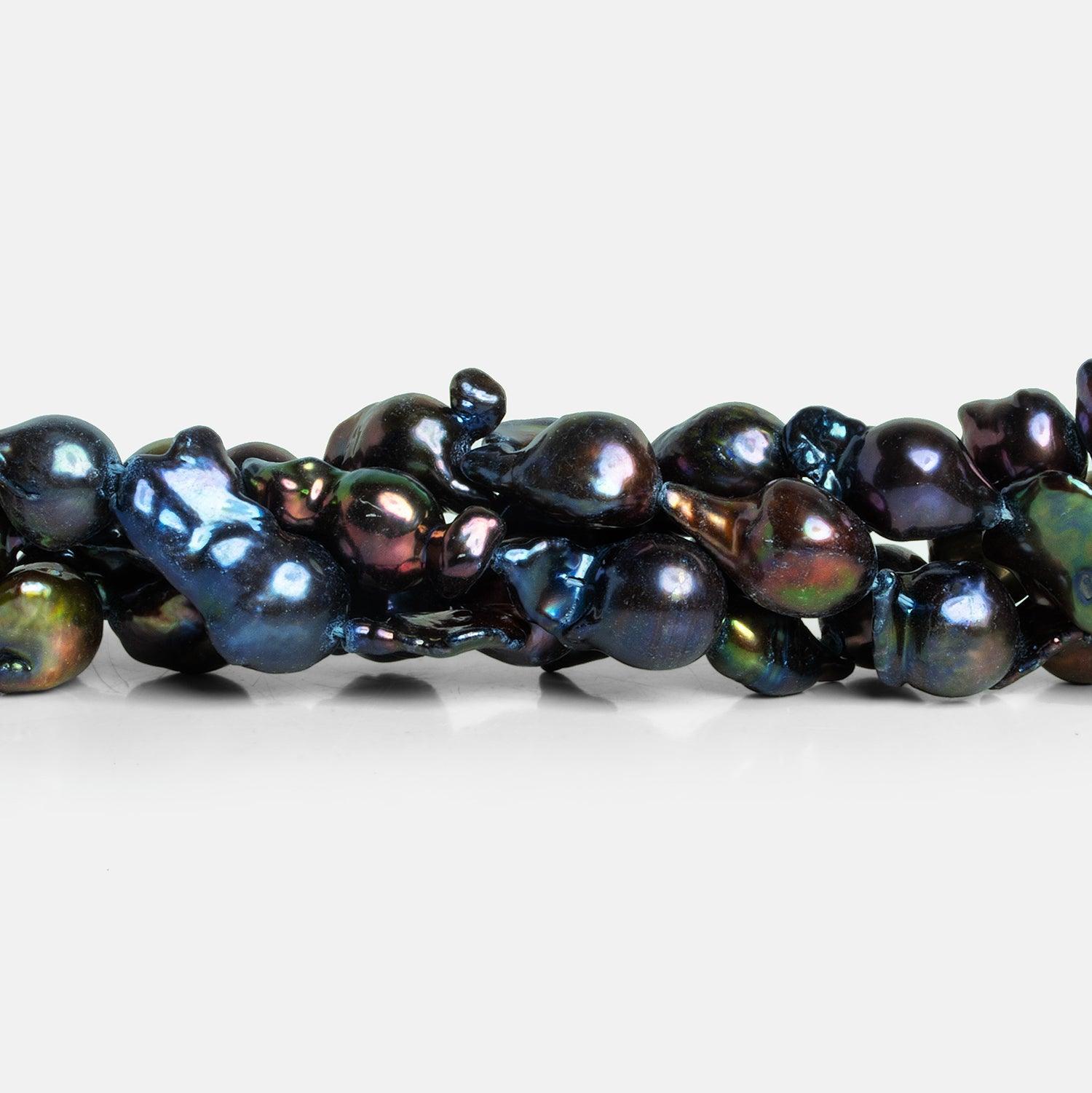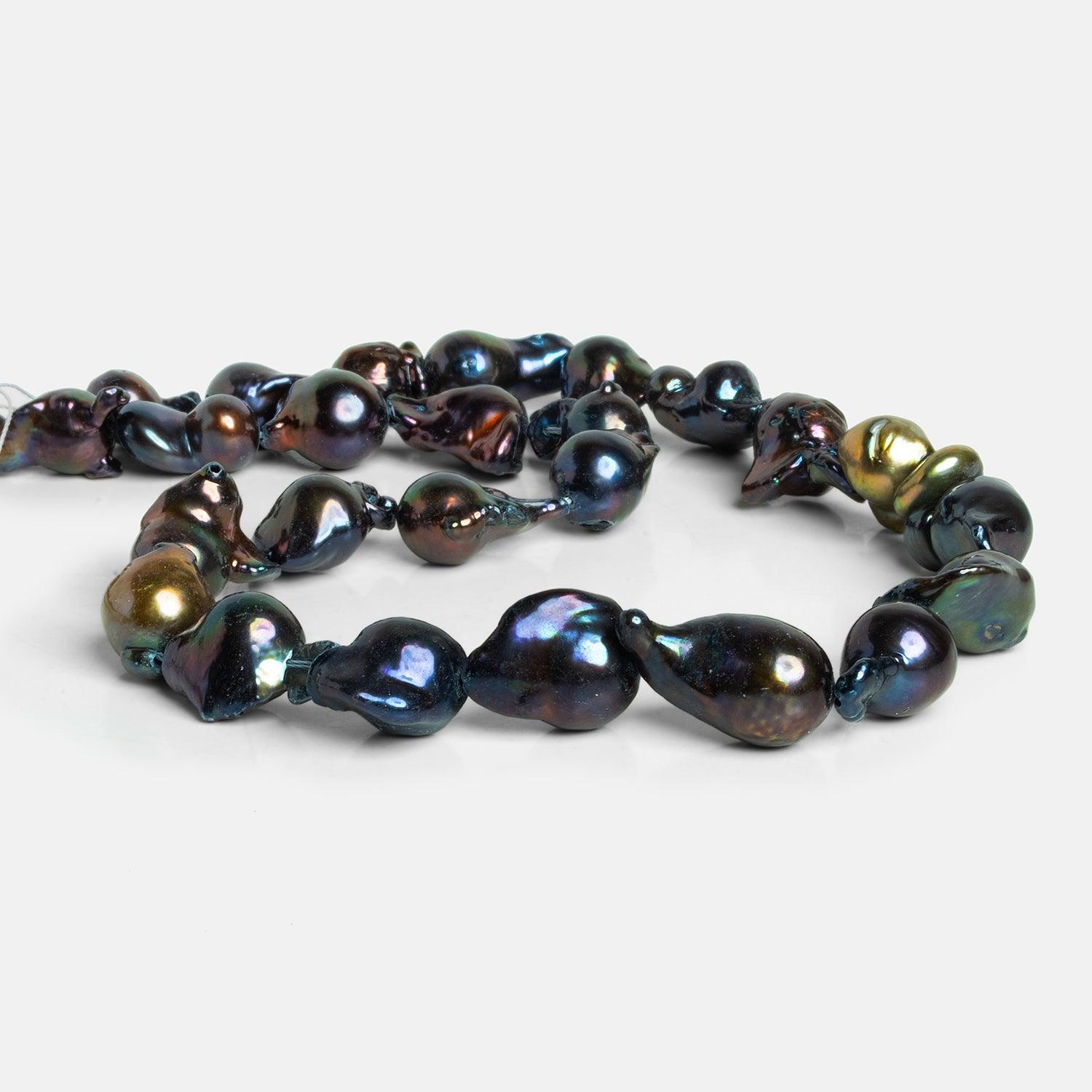 These gorgeous Ultra Baroque Freshwater Pearls measure 16x10mm to 20x13mm. Expect a beautiful, dark peacock color palette with a melange of bluish and purple tones. These sizable Ultra Baroques show off a rounded shape with a rich and sultry color across the strand.