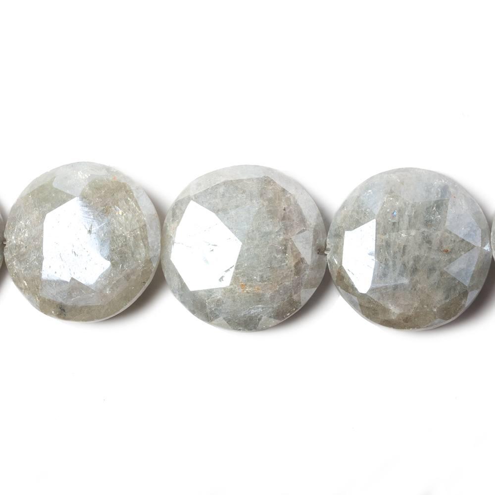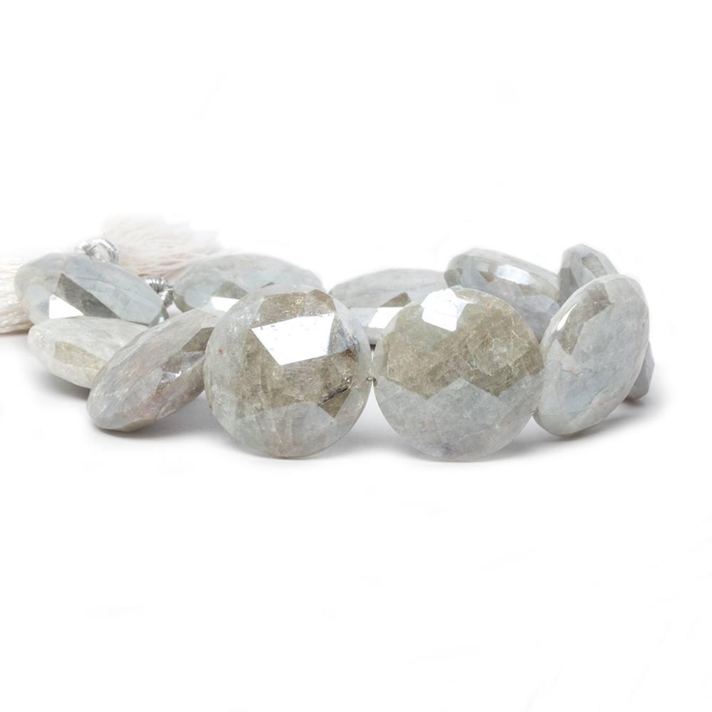 19mm up to 20mm Silver Mystic Aquamarine faceted coin bead strand measures approximately 7.75 inches in length with approximately 10 pieces.