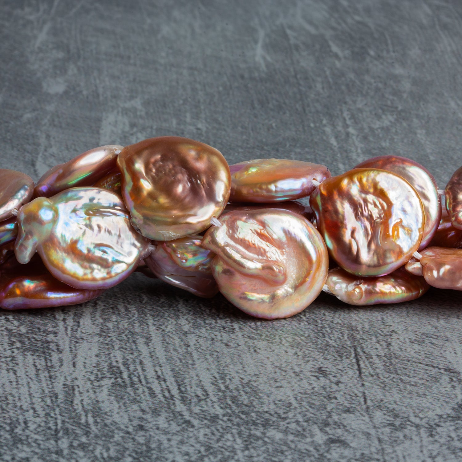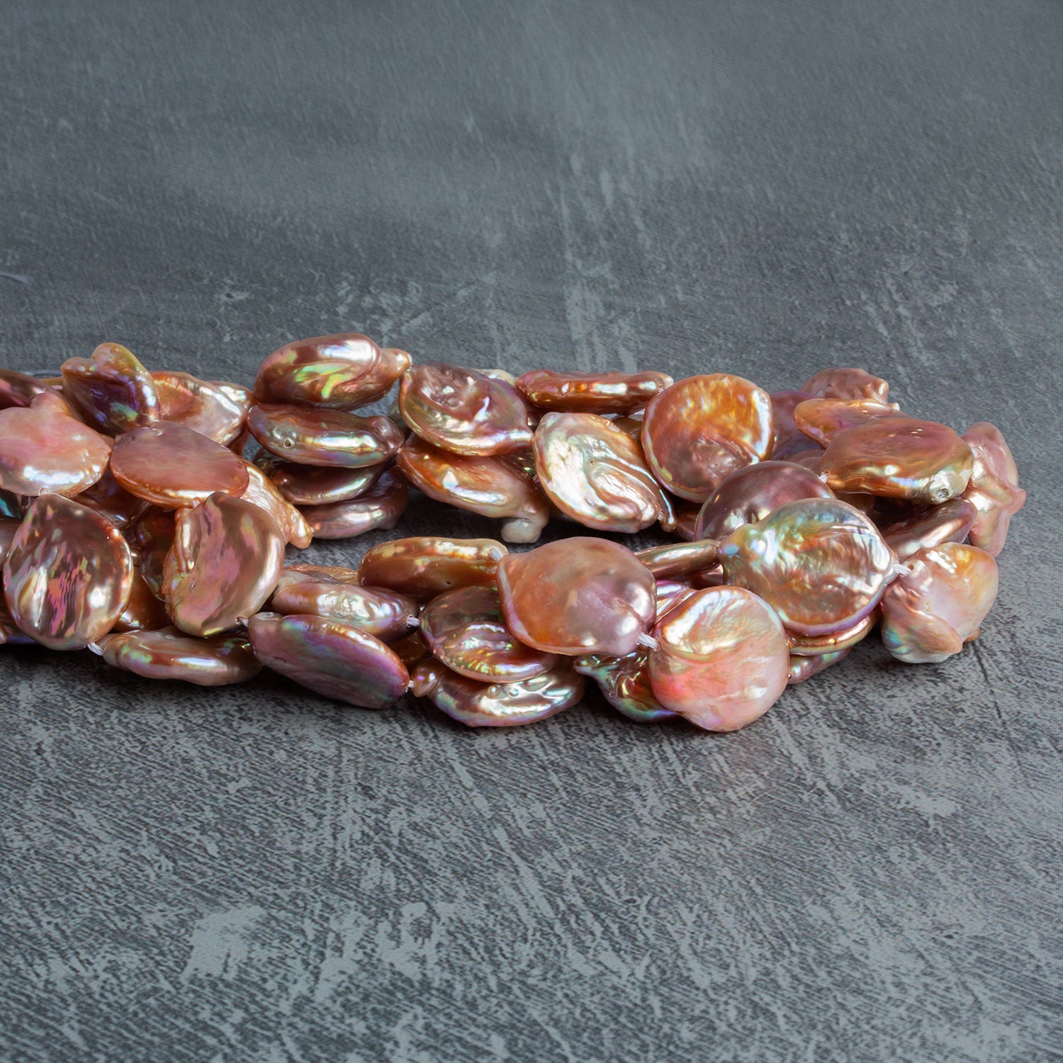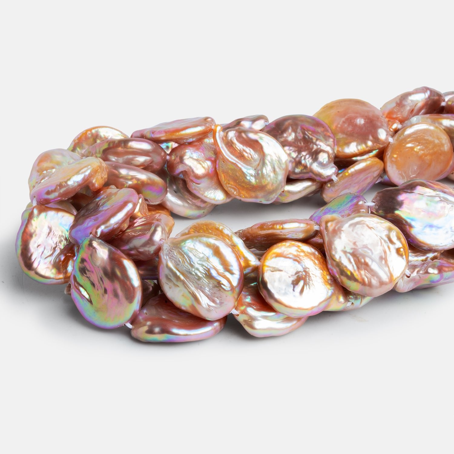 These large 19x16mm Peach Coin Pearls showcase luminous, sun-warmed tones that shift between blush, apricot, rose gold, and creamy champagne as light moves across their surface. Each organically shaped coin displays deep, mirror-like luster with subtle ridges and natural undulations that highlight the rich, thick nacre and give every pearl its own sculptural character. Their soft metallic glow feels elevated rather than flashy, making them ideal for heirloom-inspired designs or modern statement pieces alike.