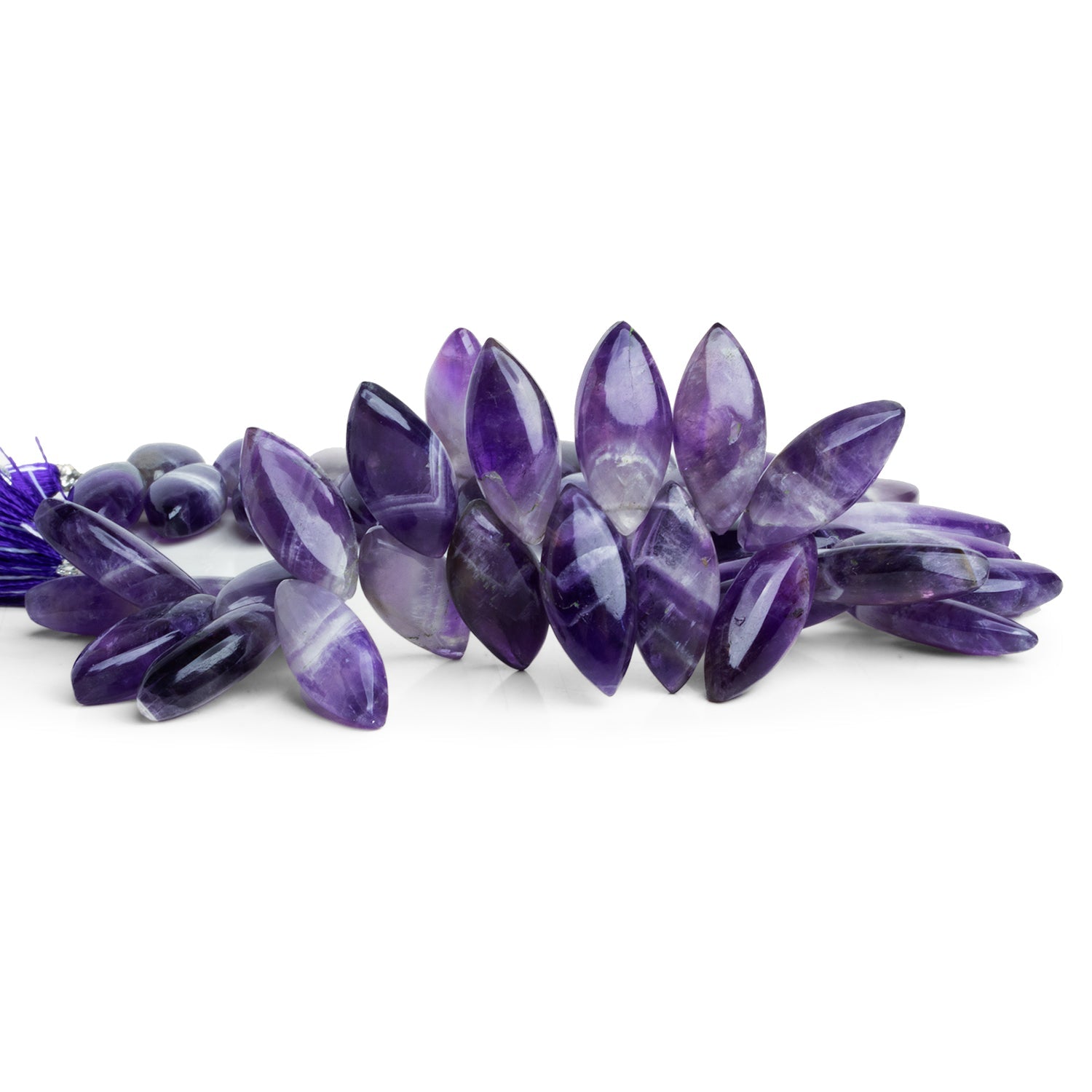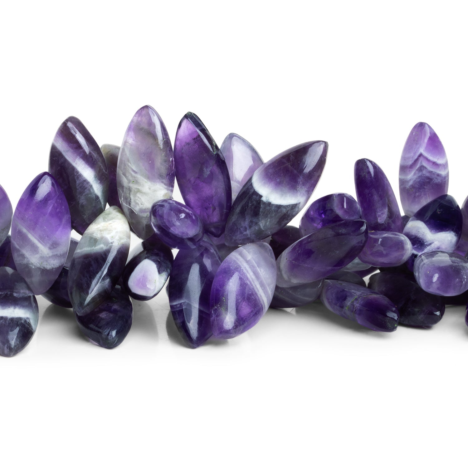 Beads measure about 19x8mm with a few mm of variation possible. Feast your eyes on the dazzling chevron patterns of Cape Amethyst, the premium variety of natural Amethyst that features this striking look. Each marquise is sizable, top-drilled and smooth polished for a versatility that rivals most beading options. Our Cape Amethyst Marquise pieces are ideal for a wide range of Jewelry Designs from necklaces to earrings and much more.