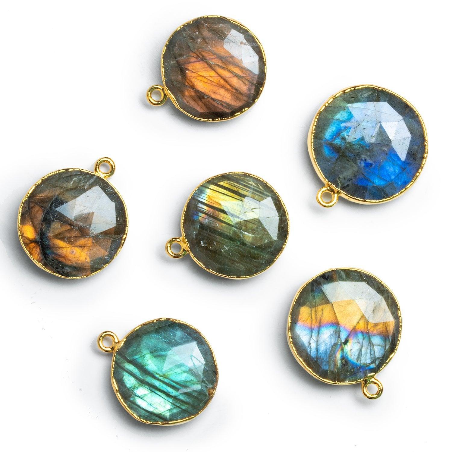 Beads average about 22mm in diameter. Expect the full range of colorful Labradorite flash on these faceted coins enveloped in our signature gold leaf.