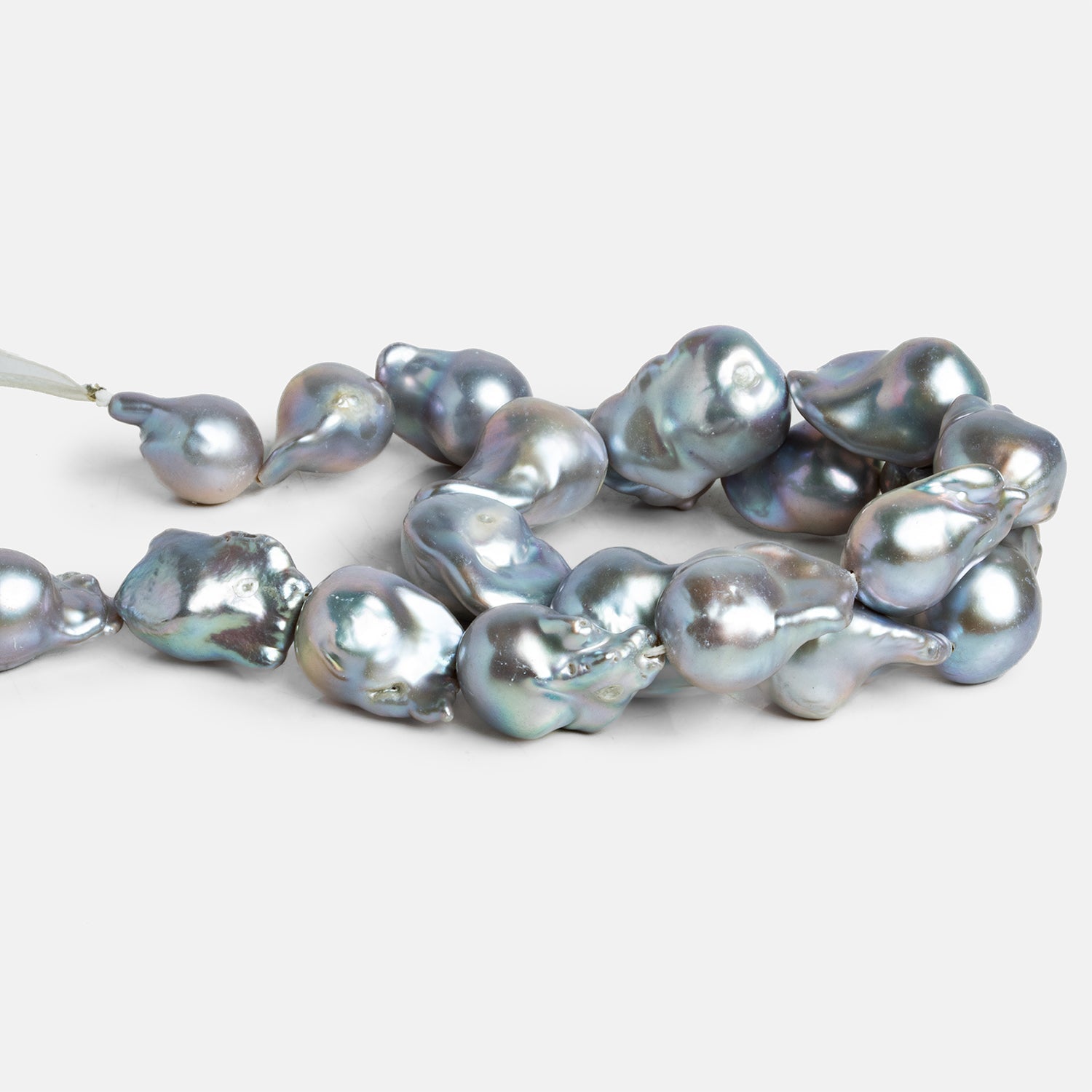 Pearls measure about 17x13mm to 27x18mm. These breathtaking, specially curated strands feature only the finest Freshwater Ultra Baroque pearls in a stunning silver palette full of both cool and rosy overtones. Expect a flameball shape with relatively short tails to predominate. Imbue your most elegant jewelry designs with the unmatched aura of these regal and sophisticated pearl offerings, perfect for necklaces, earrings and much more.