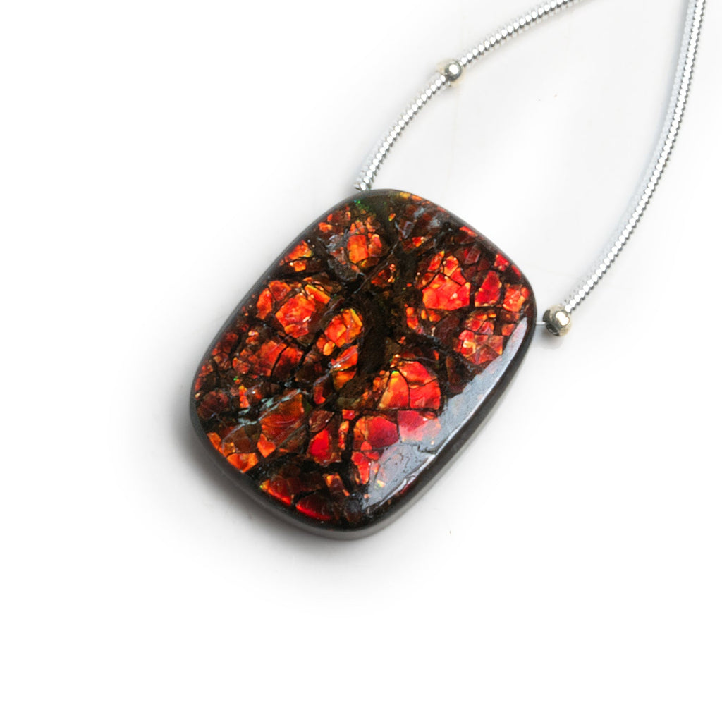 Experience the allure of this rounded rectangle shape, perfect for use as a standout focal piece in necklaces or pendants. The surfaces exhibit a spectrum of colors ranging from fiery reds, blazing oranges, and shimmering golds to electric greens, deep blues, and flashes of purple. The play of light across the Ammolite’s natural fractal-like pattern creates an ever-changing brilliance, giving each bead a unique, otherworldly appeal.
