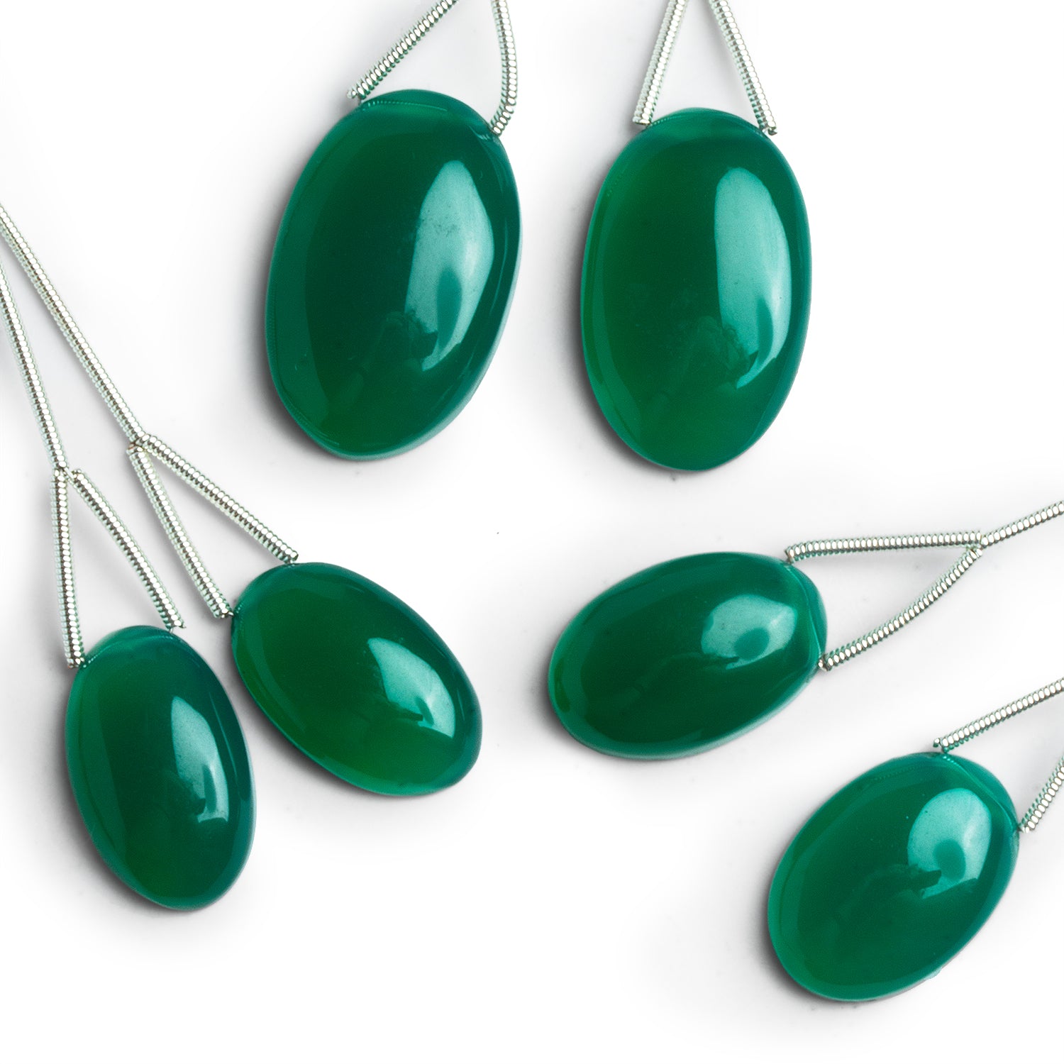 These polished oval focals showcase a rich, saturated dark green chalcedony with a sleek glassy sheen that catches light beautifully across every curve. Each set includes a carefully matched pair, giving you two harmonious centerpieces that read as intentional partners in a design rather than random singles.