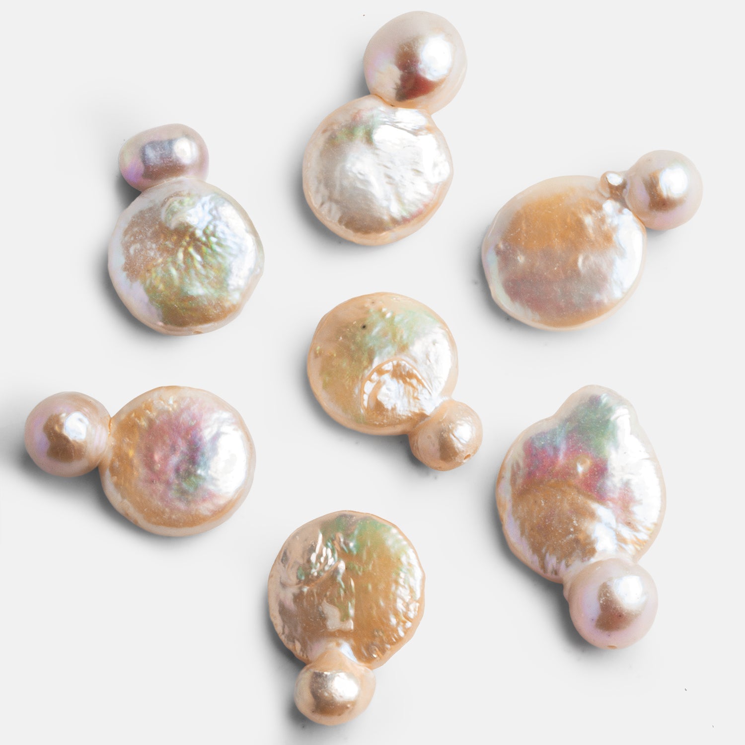 These Peach Pearl Focal Beads are the perfect way to bring elegance and individuality into your jewelry designs. Each bead features a naturally lustrous peach tone with subtle iridescent flashes of pink, green, and gold, creating a surface full of depth and dimension. Their organic “coin” shape paired with a small round accent pearl gives them a distinct focal quality, ideal for earrings, pendants, or statement centerpieces.
