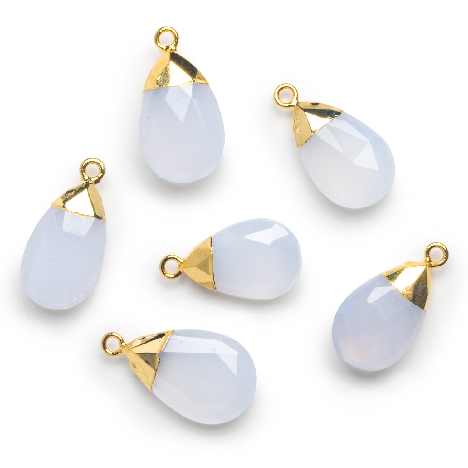 Beads measure about 24x13mm. These beauties show off a mystique filled blue hue familiar to fans of natural chalcedony. Finished of in our gold leaf, these beautiful pieces are sure to catch the eye as the focal bead of necklaces, as earrings, and more!